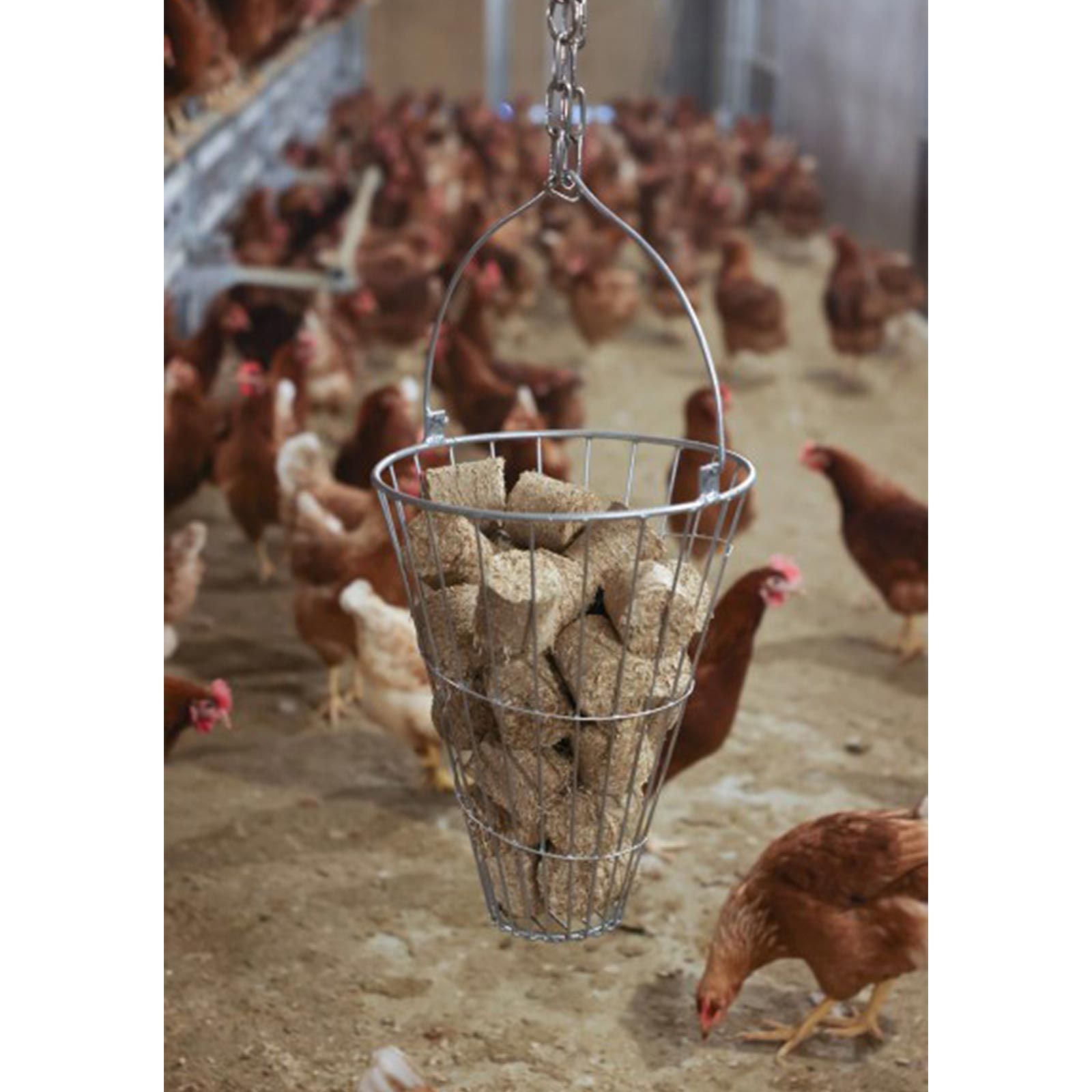 Foderkorgen är utrustad med ett robust fäste, vilket gör den vilket gör den lätt att hänga upp i i huset. Detta håller fodret rent och förhindrar att det lätt sprids i hela huset. Du kan placera korgen efter dina behov för att ge fjäderfäna bekväm tillgång till fodret.