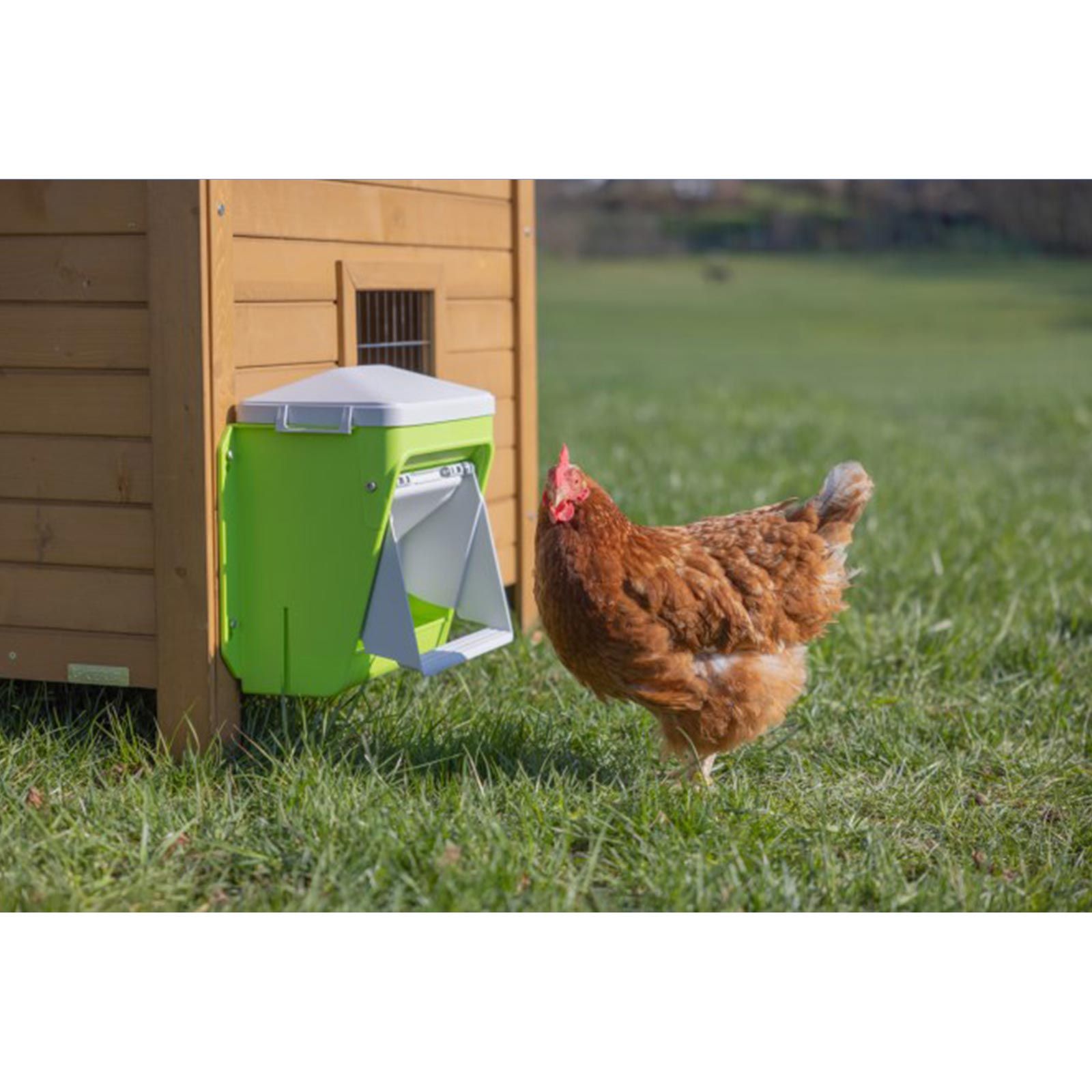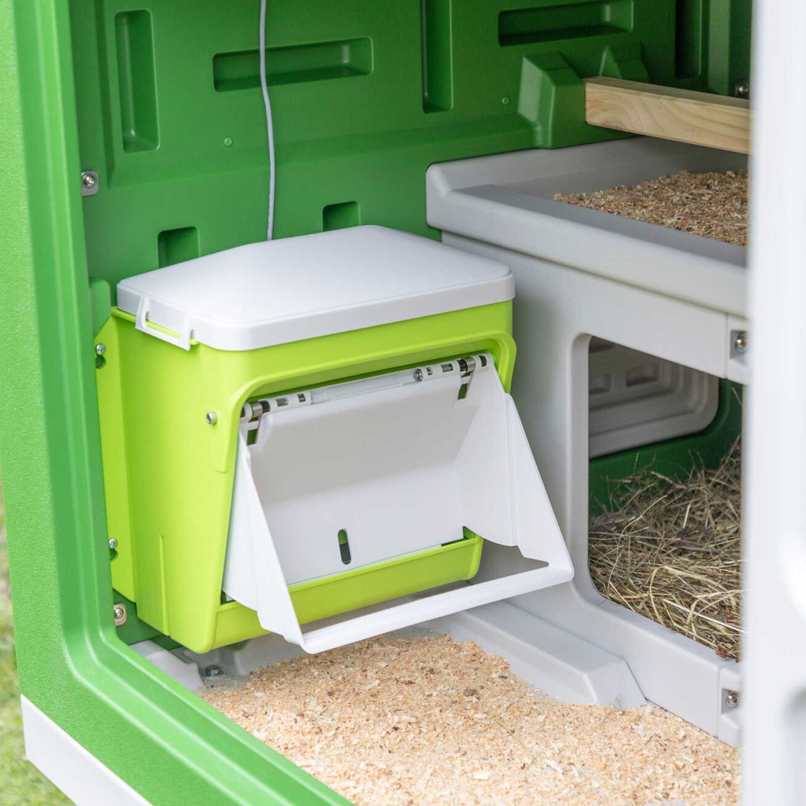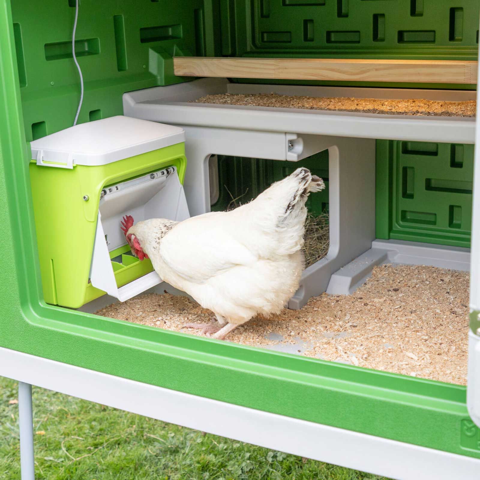 SmartCoop-mataren ser till att dina kycklingar alltid har tillgång till kycklingfoder. Den Foderautomatens klaff öppnas när en kyckling trycker på fotsteget och låter kycklingarna äta tills de går. Fjädermekanismen gör det enkelt för små och stora kycklingar att trycka ner det högre steget, medan gnagare, som möss eller råttor, har betydligt svårare att komma åt fodret.