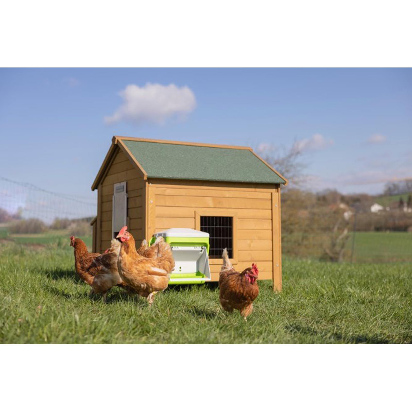 - Skyddsklaffen kan fixeras öppen så att hönsen kan vänja sig vid systemet