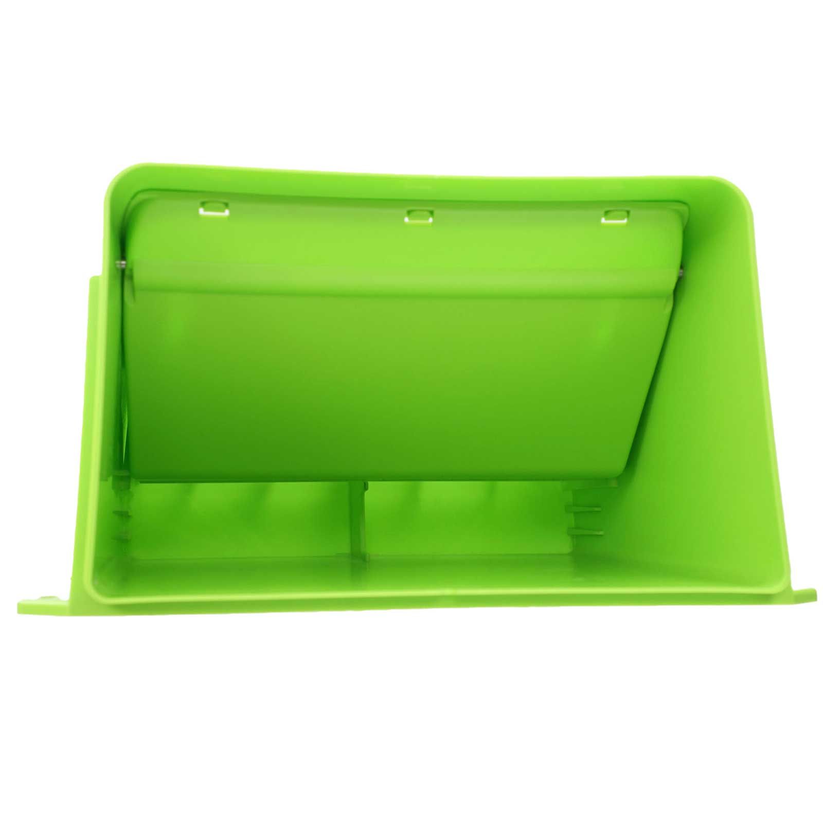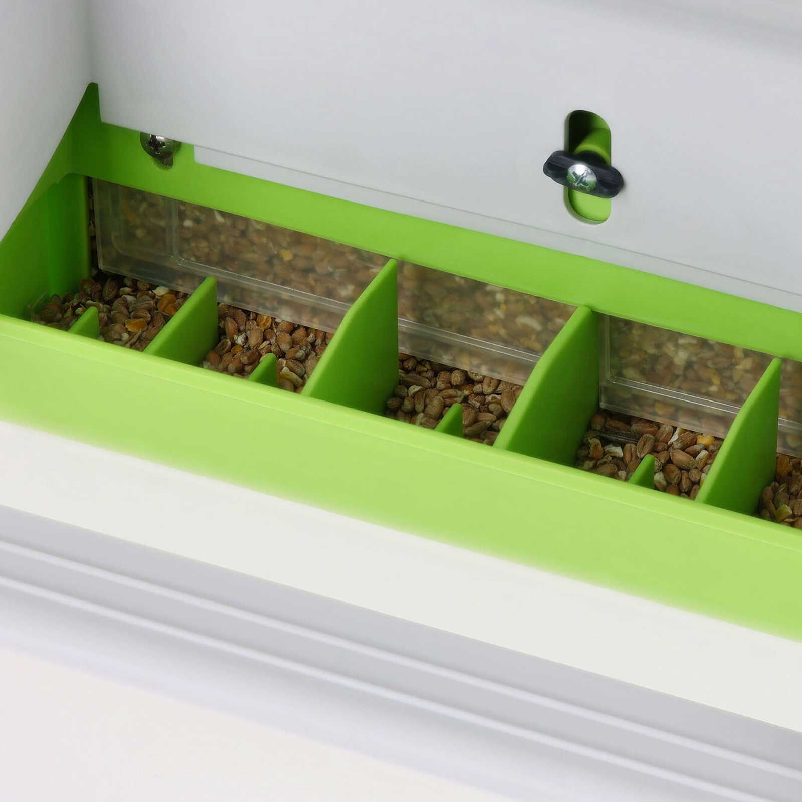Skyddsklaffen kan fästas öppet för acklimatisering. Den höjdjusterbara skiljeväggen gör att fodret kan justeras för mjöligt eller grovkornigt foder. Foderautomaten kan tas bort utan verktyg för enkel rengöring eller påfyllning. Den levereras med väggfäste och skruvar för utrymmesbesparande och säker installation. Den är tillverkad av robust, slagtålig och och hållbar plast tillverkad.