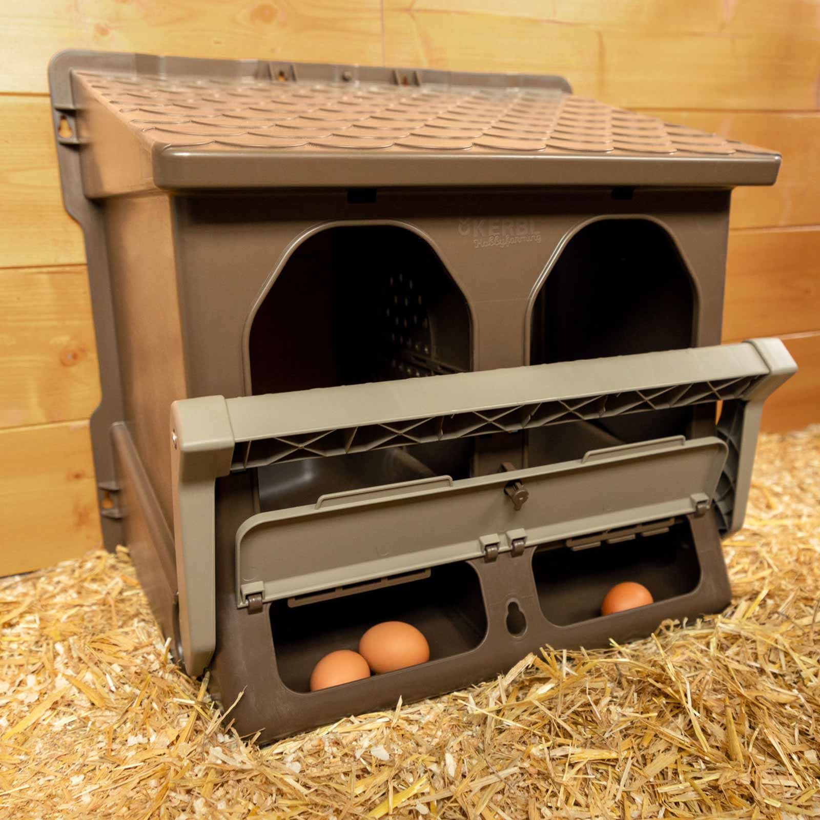 Tack vare en invändig skiljevägg kan värpredena delas upp i två inredningsfack ruvningsfack. Dubbelboet har en stor äggtank med hög kapacitet som rymmer upp till 10 ägg per redefack. Den låsbara inspektionsluckan gör det enkelt att inspektera, medan det sluttande golv säkerställer enkel borttagning av äggen.