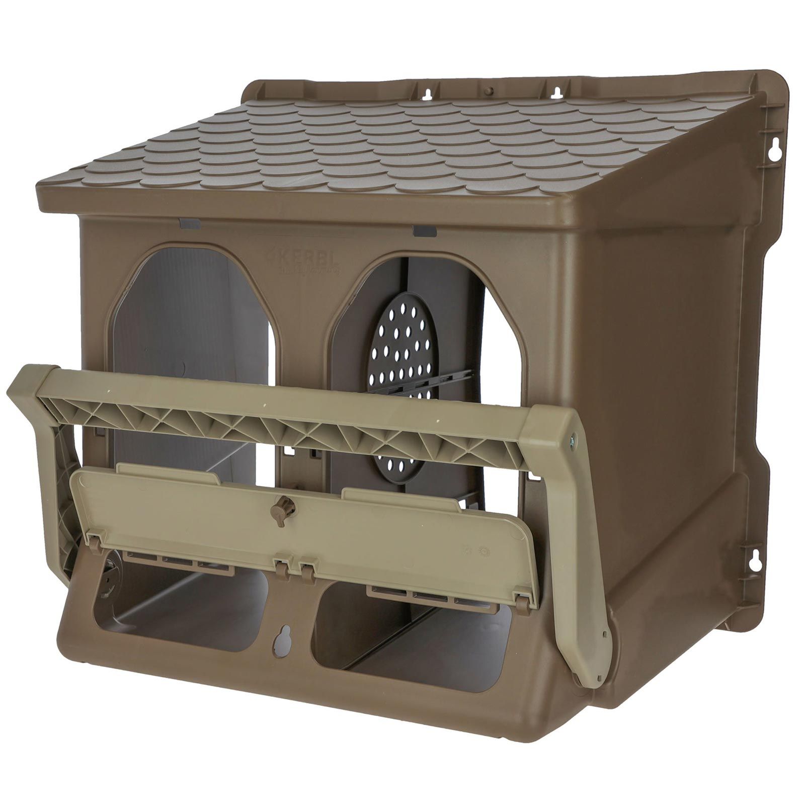 Det dubbla boet för kycklingar uppfyller kraven i djurskyddsförordningen för höns (TierschNutztV) för kommersiell hållning, vilket innebär att minimistorleken för varje värprede är 35 x 25 cm.