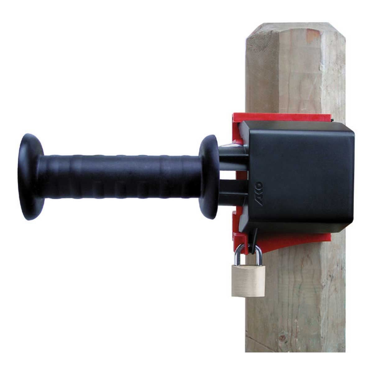 Det låsbara grindsystemet: Haka fast grindhandtaget i anslutningsplattan - skjut säkerhetsluckan i botten - lås hänglåset - klart! Grindhandtaget är därmed fast förankrat i det låsta säkerhetshuset och endast behöriga personer har tillgång till betesmarken.