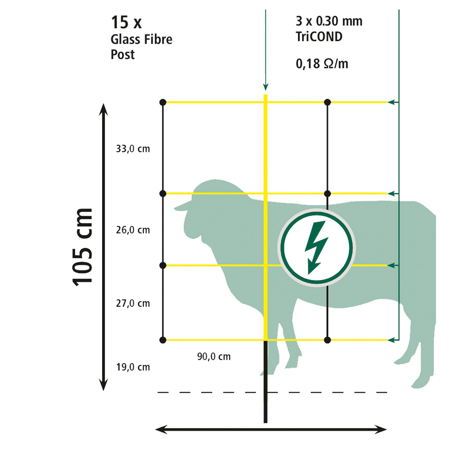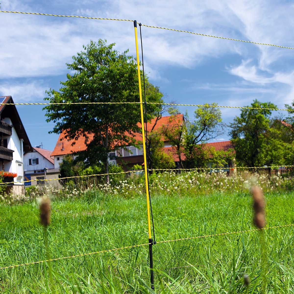 Observera:Fårnätet EasyNet har ett mycket lågt motstånd genom att använda AKO TriCOND-ledartrådar. Detta ger en mycket hög ledningsförmåga. Nätet är 50 m långt och innehåller 15 glasfiberpinnar.