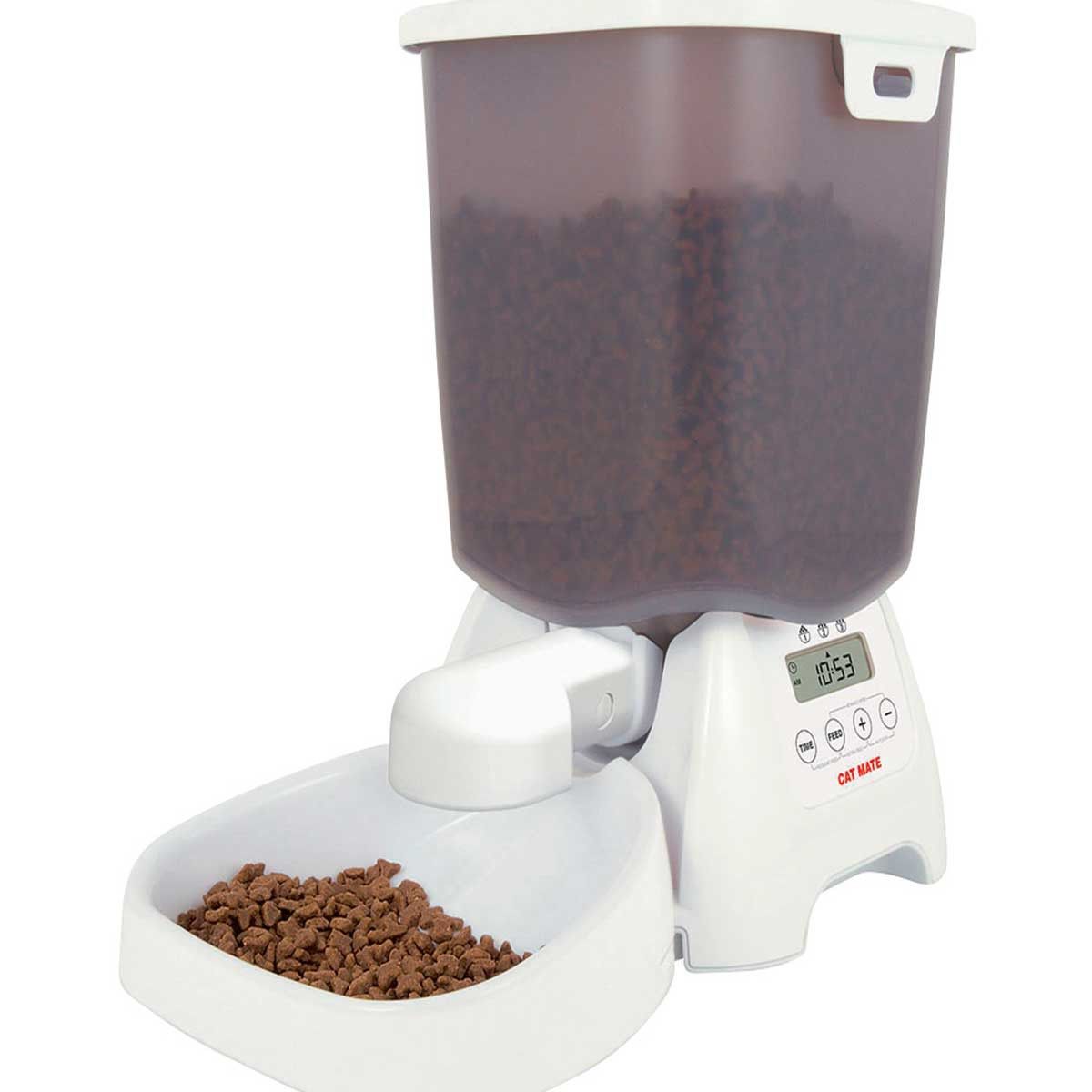 Pet-Mate® torrfoderautomat dispenserar exakt den rekommenderade mängden torrfoder för att minimera hälsorisker och undvika högre kostnader orsakade av överutfodring . Den automatiska mataren låter dig programmera upp till tre individuellt bestämda portionsstorlekar under dagen. Om så önskas kan matportionerna även levereras före sin programmerade tid. Alternativt kan mataren användas manuellt för att dispensera exakta portioner av mat vid behov, eller i ett "frequent matningsläge" enligt specifika kostkrav, såsom diabetes.