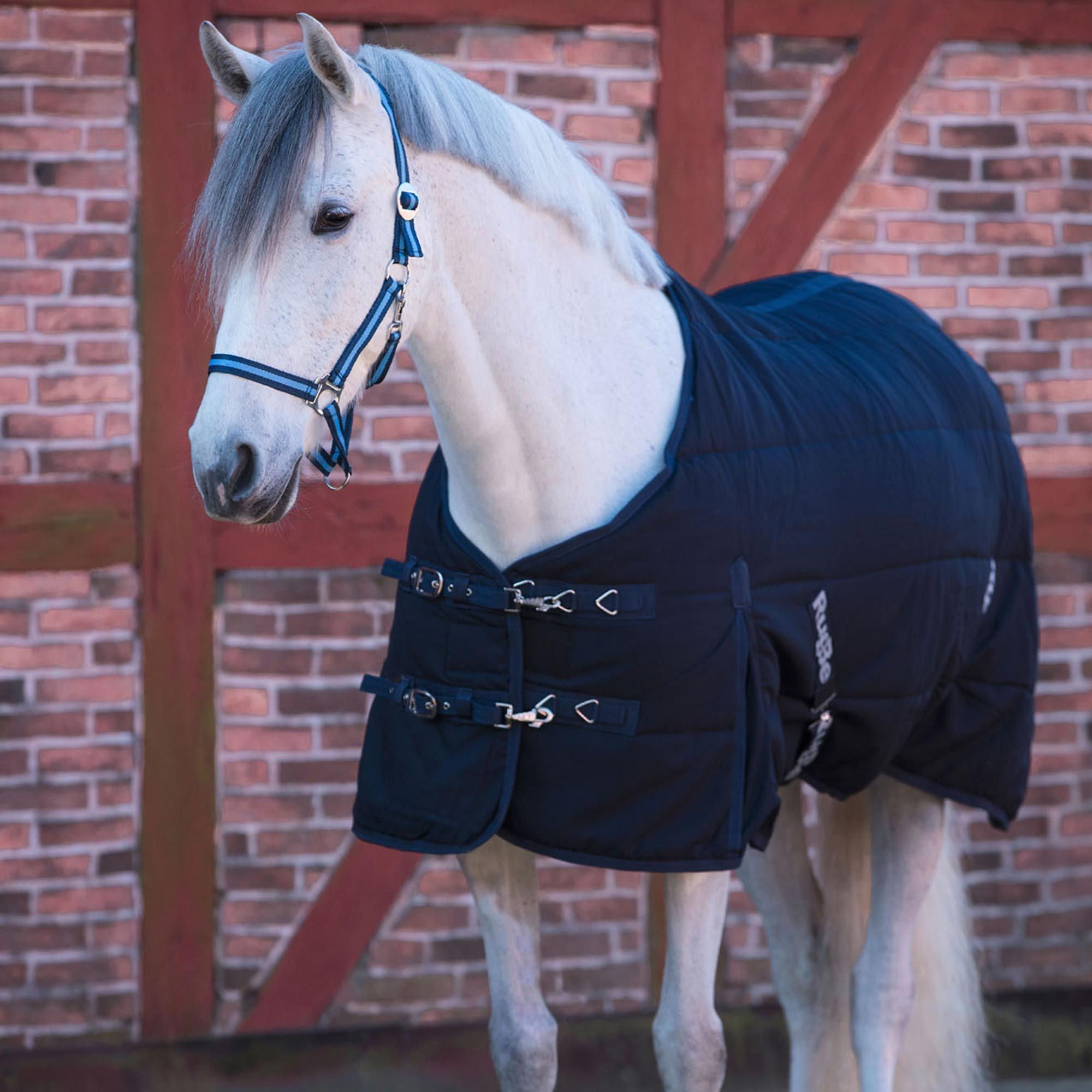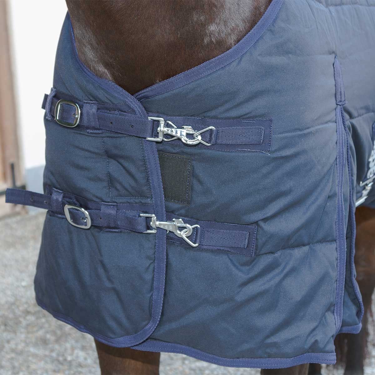 Underfilten eller stallfilten är utrustad med en bred svans och justerbara benremmar. Ett dubbelt bröstspänne med taggspännen, karbinhakar och D-ringar ger ett bra grepp. Den varma stallfilten är fodrad med 150 g och värmer din häst i kalla temperaturer. Den mjuka hästfilten är fodrad med ett bekvämt bomullsfoder som inte skaver på pälsen.