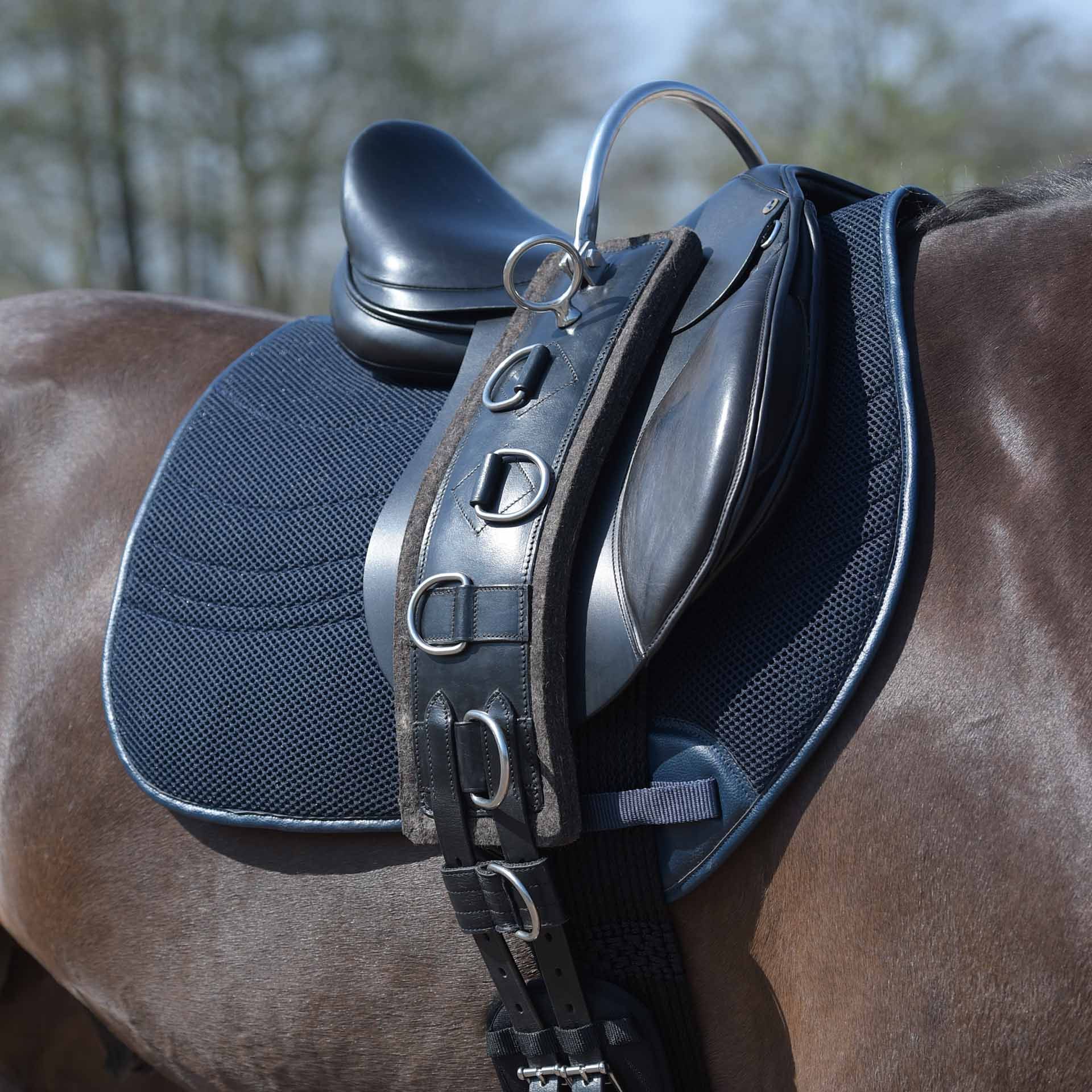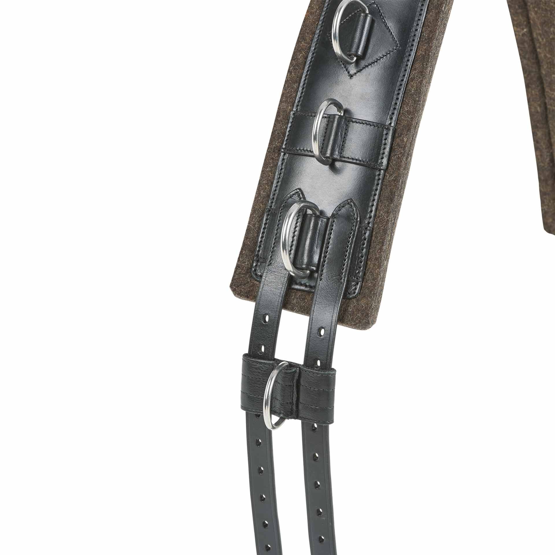 - Dubbla bältesremmar på båda sidor för användning av valfri kort omkrets beroende på hästens omkrets och materialpreferens - därför inget midjebälte som ingår i leveransen