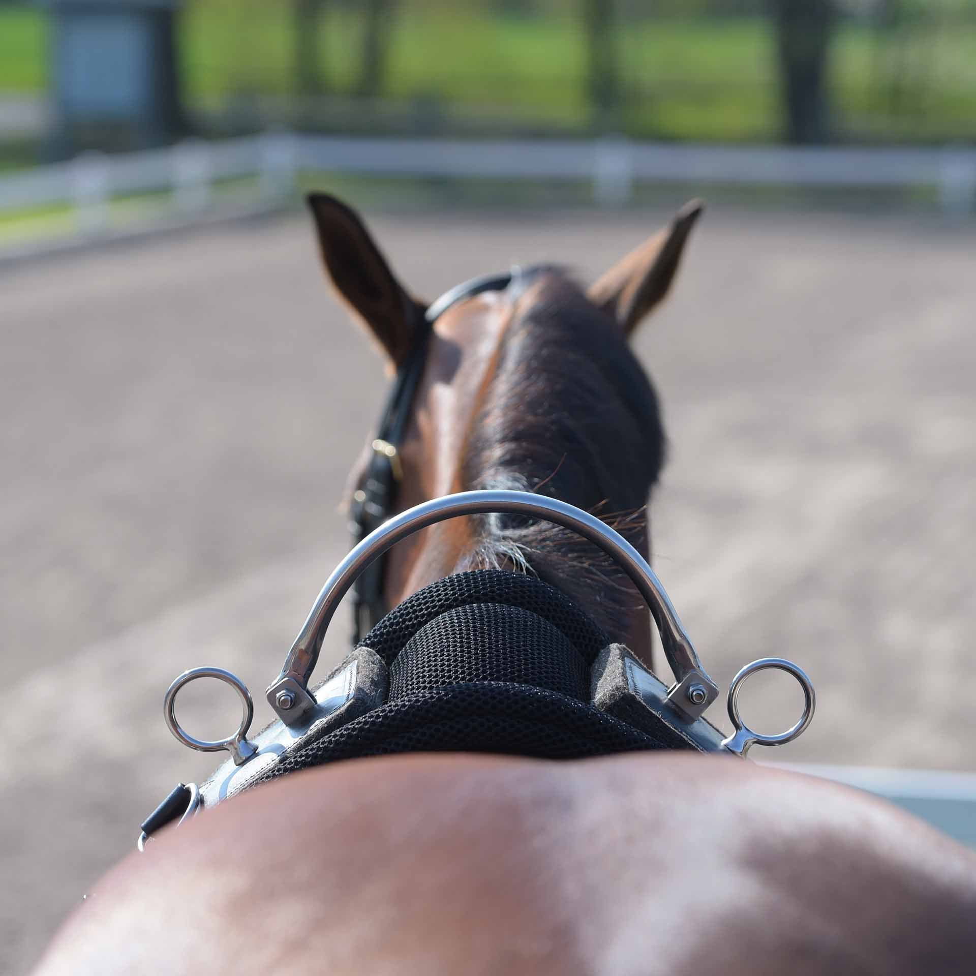 FLEX FIT utfallsbälte undviker därför medvetet tjock stoppning och är istället utrustad med stabil, bred och extra platt filtstoppning. Den speciella mankstången i rostfritt stål, med individuellt justerbara vinkelsidodelar, säkerställer optimal anpassning till hästens revbensbåge, för idealisk stöd och tryckfördelning samtidigt som manken och ryggraden på ett säkert sätt avlastar - utan tjock stoppning och oavsett hur respektive manke är uttalad.