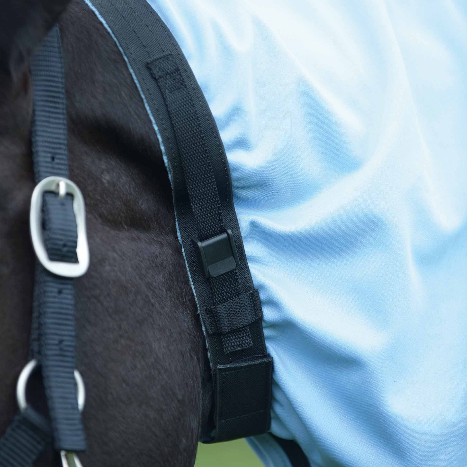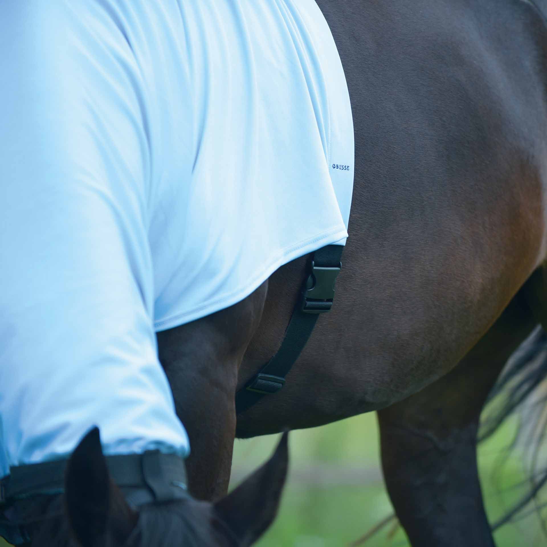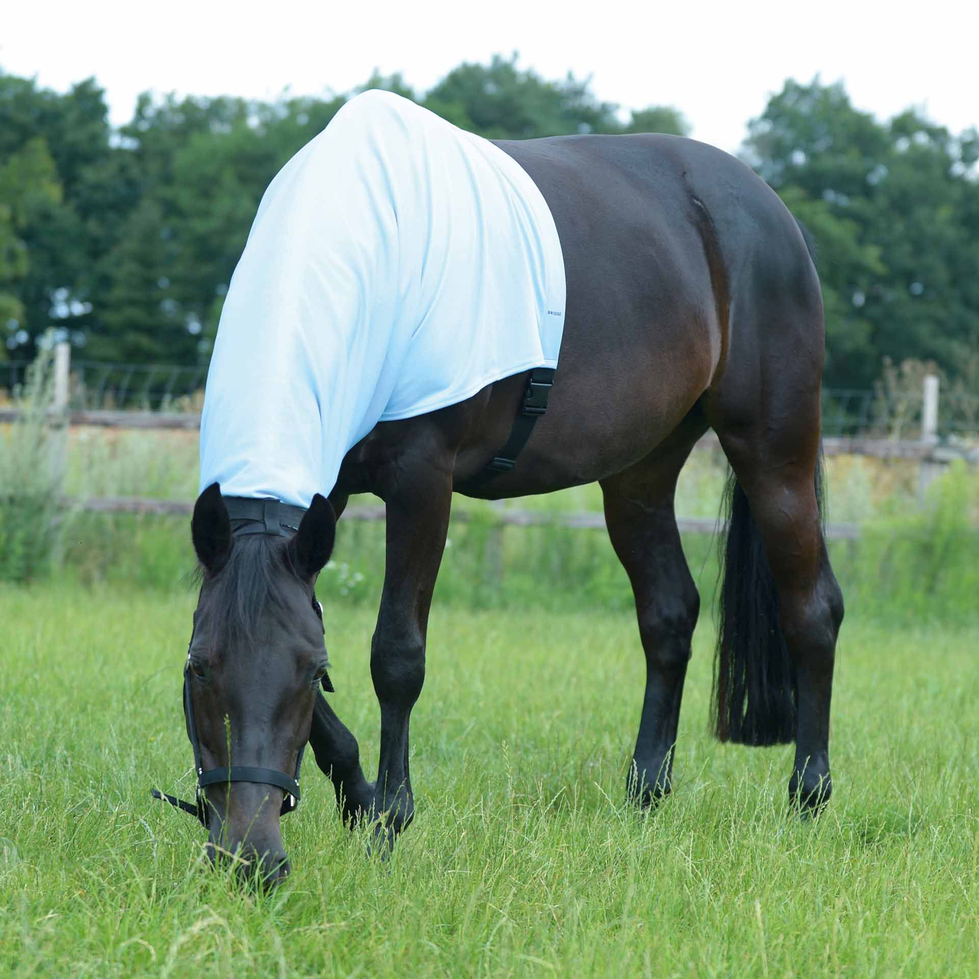 Det rymliga snittet till sadelpositionen är underlagd med softfleece för att undvika skurpunkter och öka komforten för din häst. En fast chock för fästning till grimman i nackområdet ger ytterligare säkerhet och bekvämlighet. Materialet är en snabbtorkande, andningsbar, något elastisk polyesterblandning.