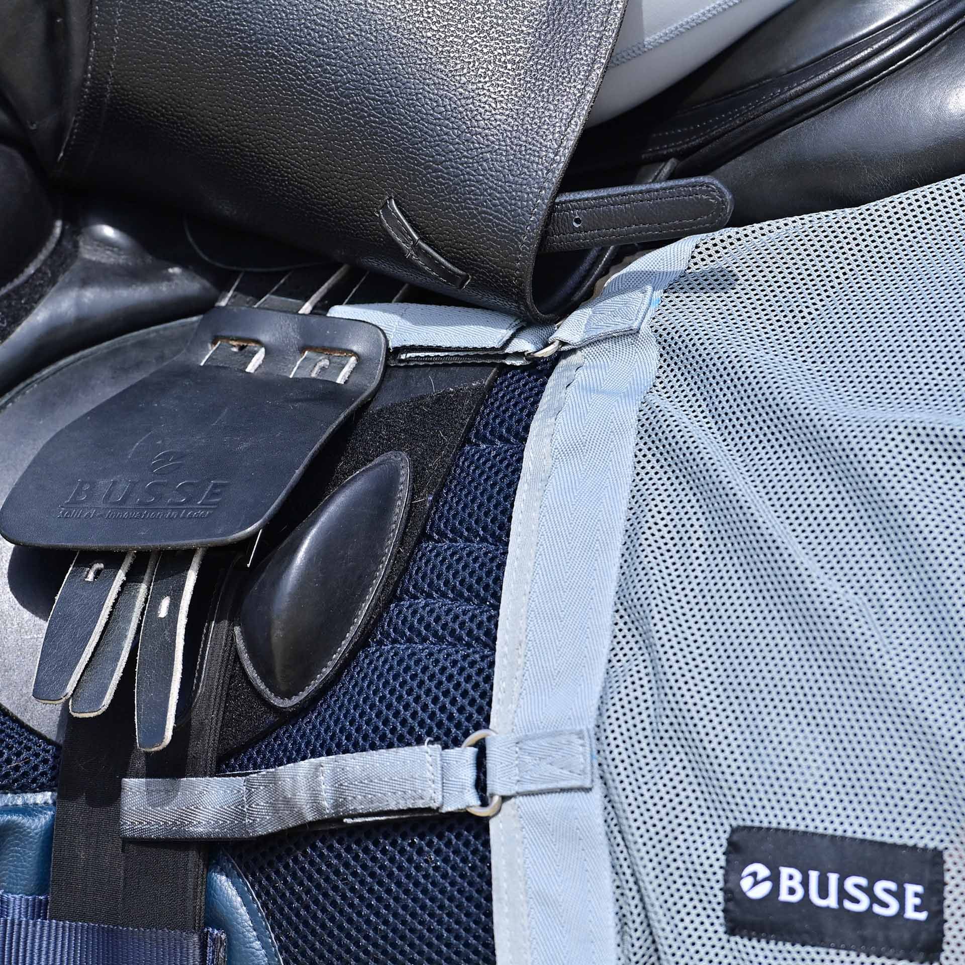 bussarnas takfluga är ett idealiskt flygtak för att skydda mot irriterande insekter i njur-, croup- och flankområdet. Det hjälper hästar och ryttare att koncentrera sig på sina uppgifter under träning utan förlust av koncentration utan att störas av irriterande skadedjur. Taket är säkert att fixa och är också lämpligt för användning i högre gångar eller vid hoppning. Det kan också tas bort utan att behöva lossa eller servera sadeln.