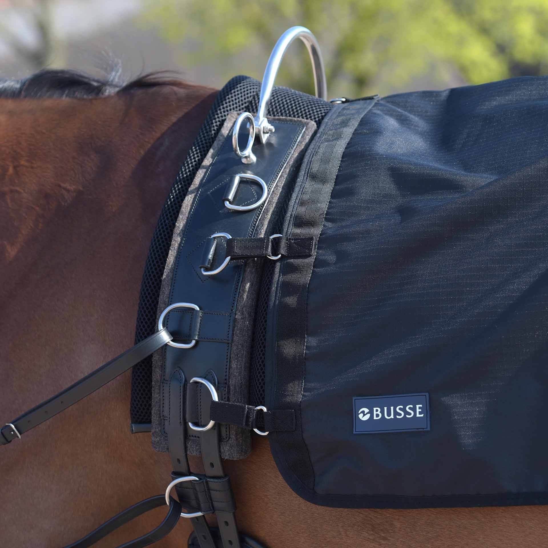 Busse Lungierdecke Rain 50 skyddar din häst från vind, regn och kyla under lungning eller jordarbete. Den är gjord av robust 600 polyester ripstop, vindtät, vattentät, andningsbar och erbjuder lätt värmeisolering.