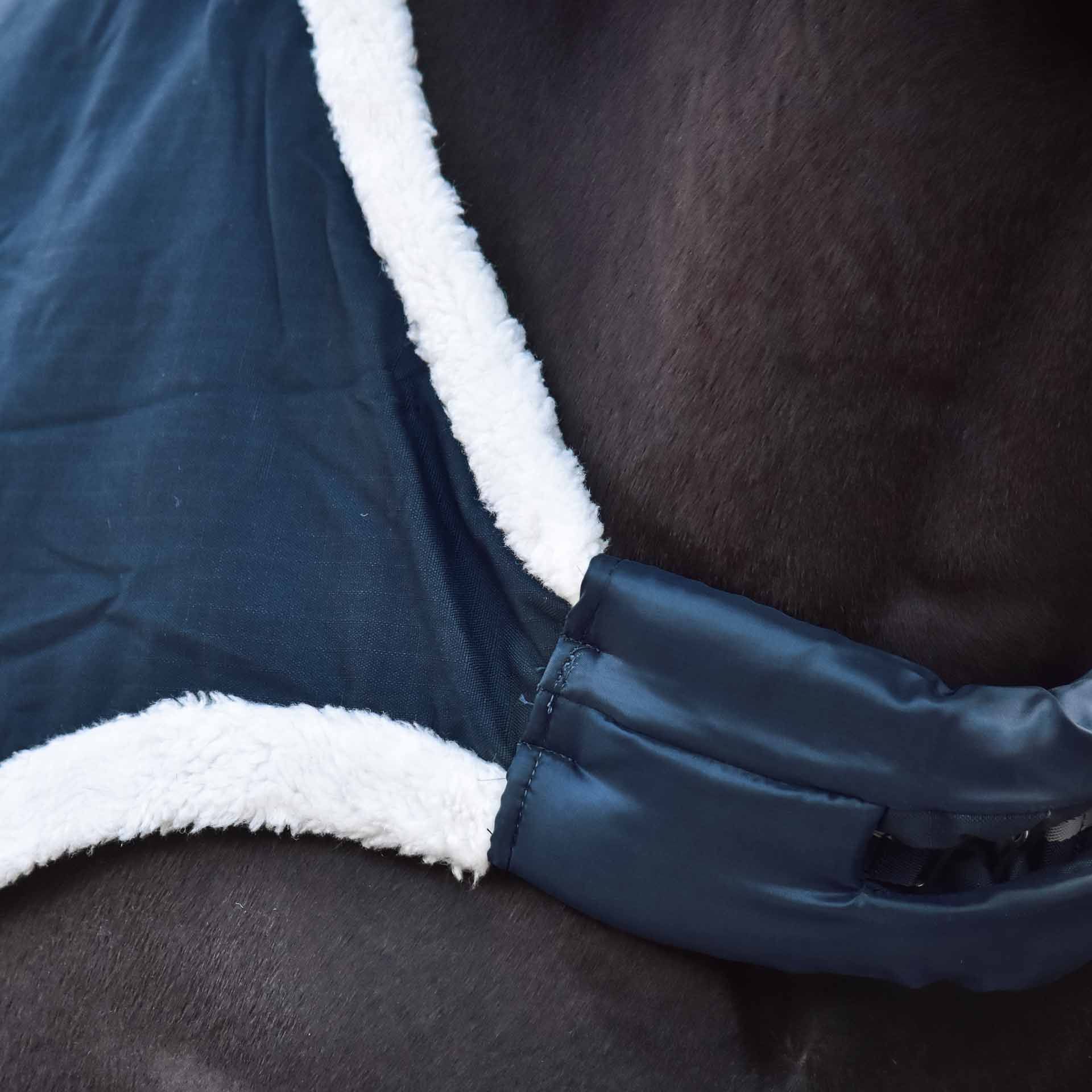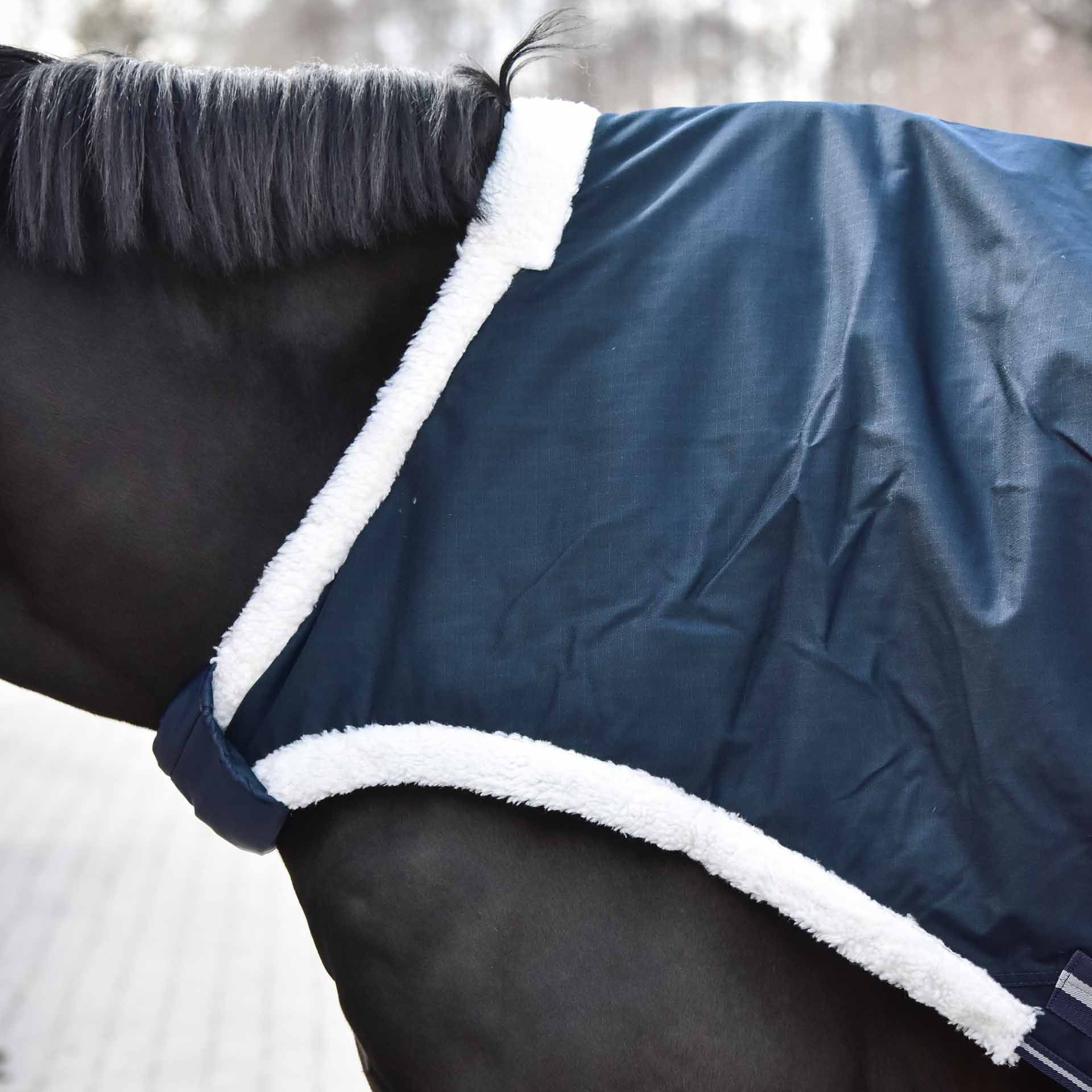 Taket består av ett hållbart 600 Polyester ripstop yttre material, som är vindtät, vattentät och andningsbart. Dessutom säkerställer lätt värmeisolering med 100 g polyfill värmekomfort på svalare träningsdagar. Pälsvänlig satinlining är utformad så att den inte påverkar hästens rörelse.