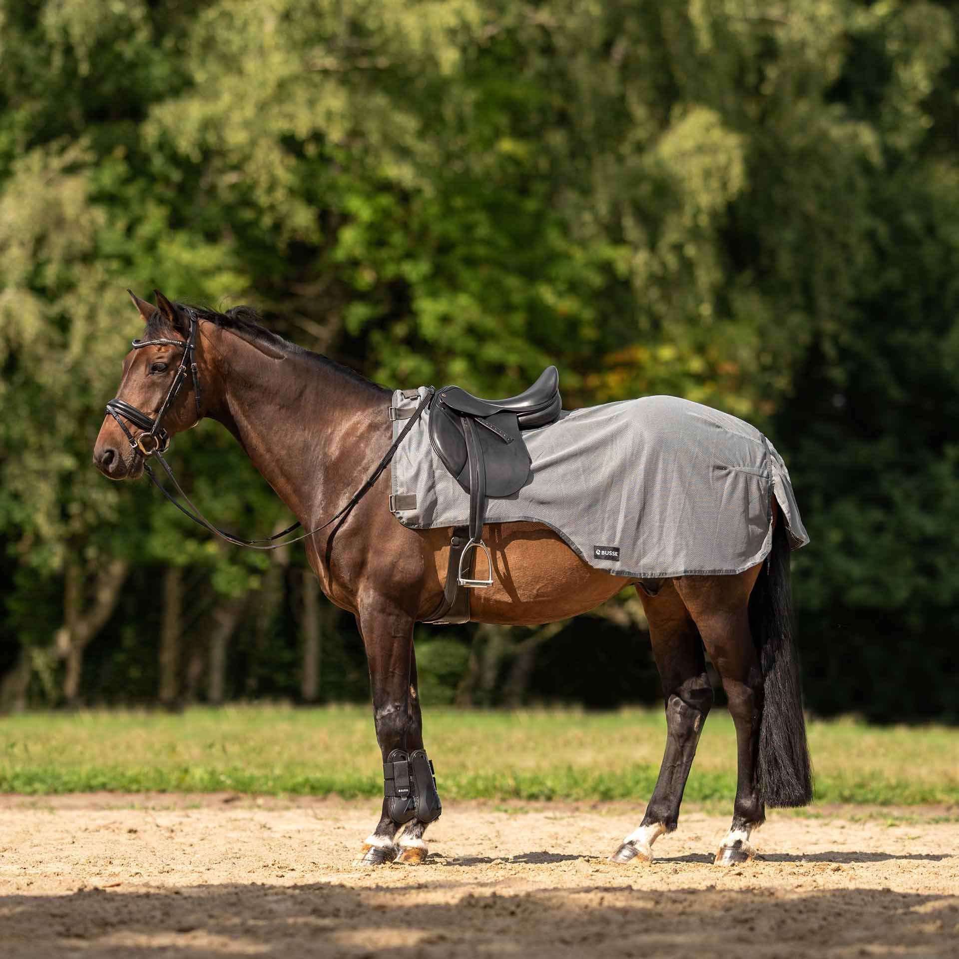 Taket består av polyestermaterial i speciell vävningsstruktur. Detta material är nära och särskilt stabilt, vilket säkerställer ett effektivt skydd mot flygning. Dessutom är det snabbt torkande och andningsbar, vilket erbjuder ytterligare komfort för din häst.