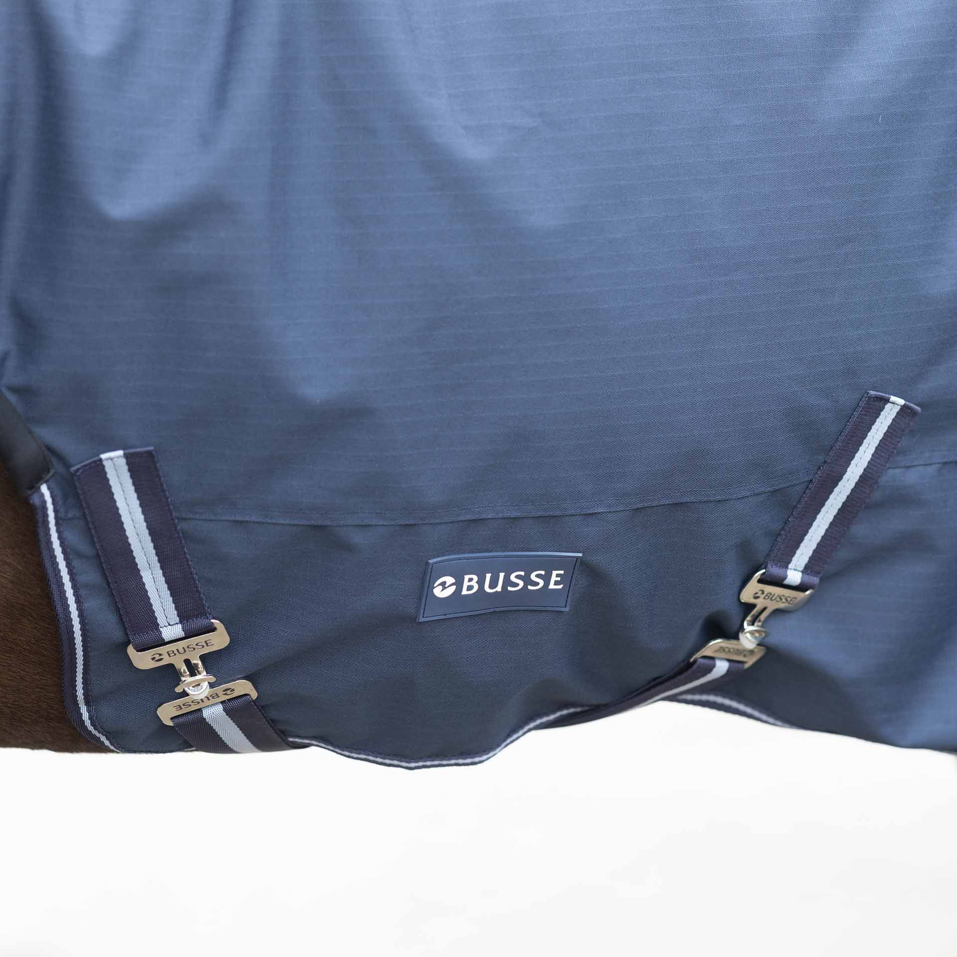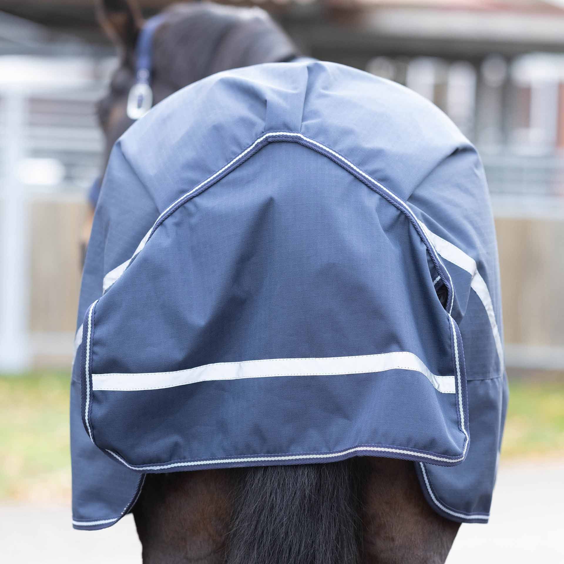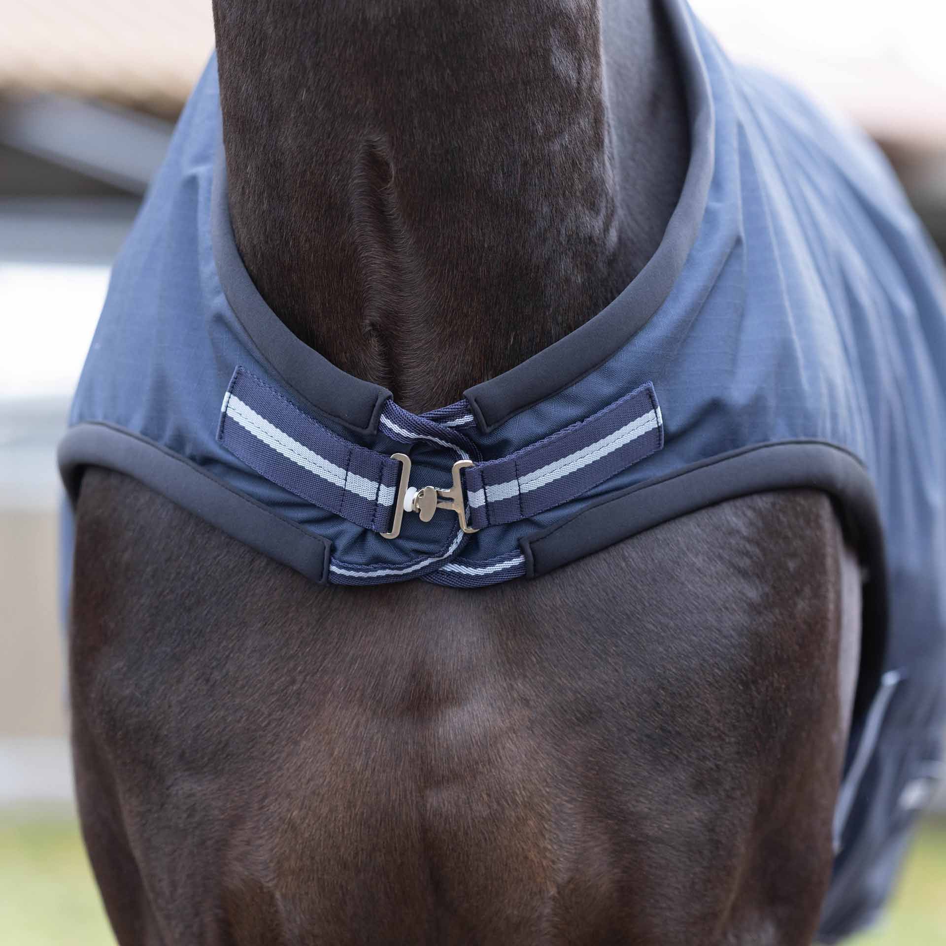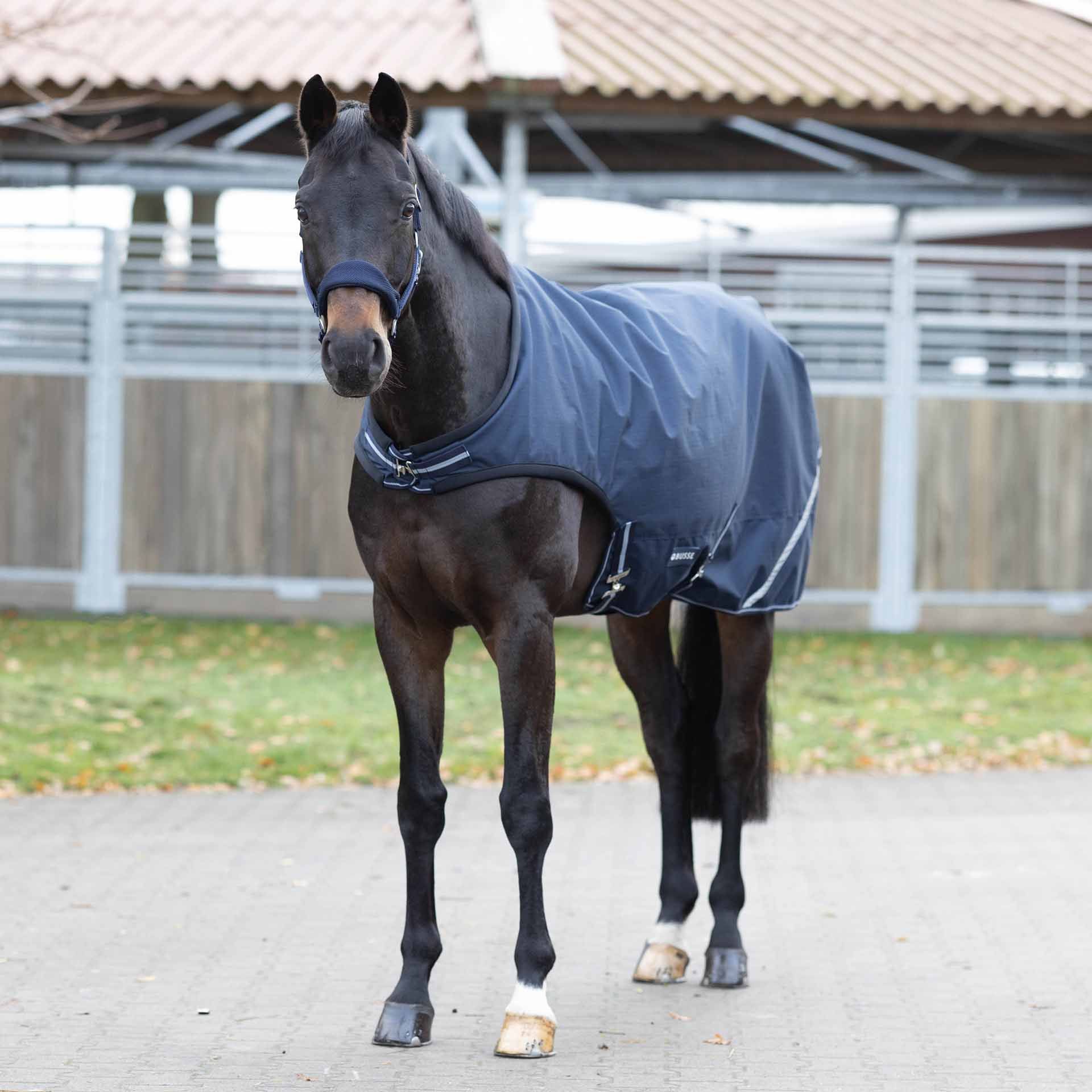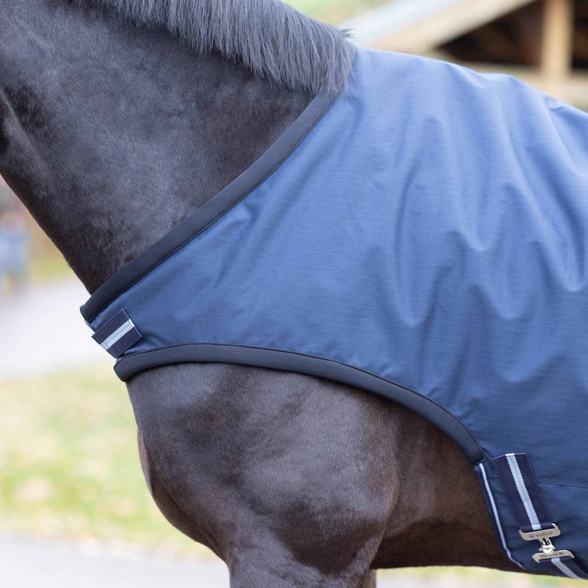 Taket består av ett hållbart 600 Polyester ripstop yttre material, som är vindtät, vattentät och andningsbart. Den lilla termiska isoleringen av 100 g polyfillfyllningen hjälper hästen att hålla sin optimala temperatur. Dessutom är den utrustad med ett extremt glidande satinfoder, vilket säkerställer en pälsvänlig rörelse utan att gnugga. Axel-, bröst- och nackområdet är helt gränsade till mjukt, gosigt, syntetiskt gummi med en hudvänlig tröja yta. Reflektorremsor på båda långa sidor och svansen täcker synligheten i mörkret.