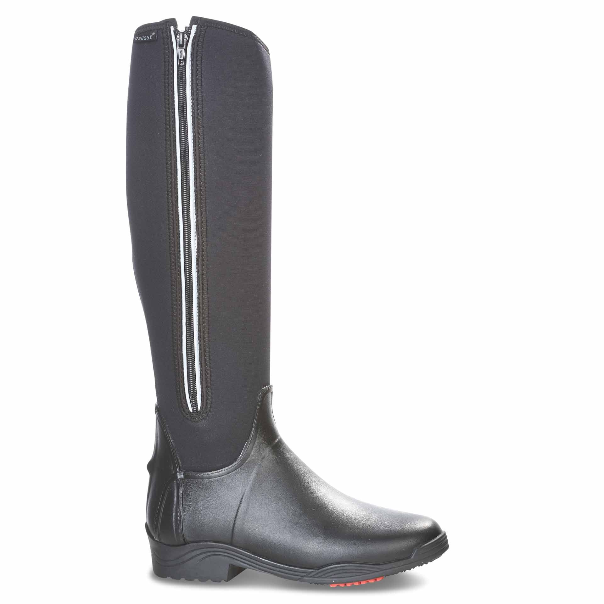 Busse REIT-Mud Boots Calgary är funktionella, vattentäta lera stövlar med en anatomiskt förformad ridstövel från Neoprene , en tunn, halkkalvförstärkning och en dragkedja på sido. De har också en söm -fri, vattentät fotdel i ridstövlan och en ridning.