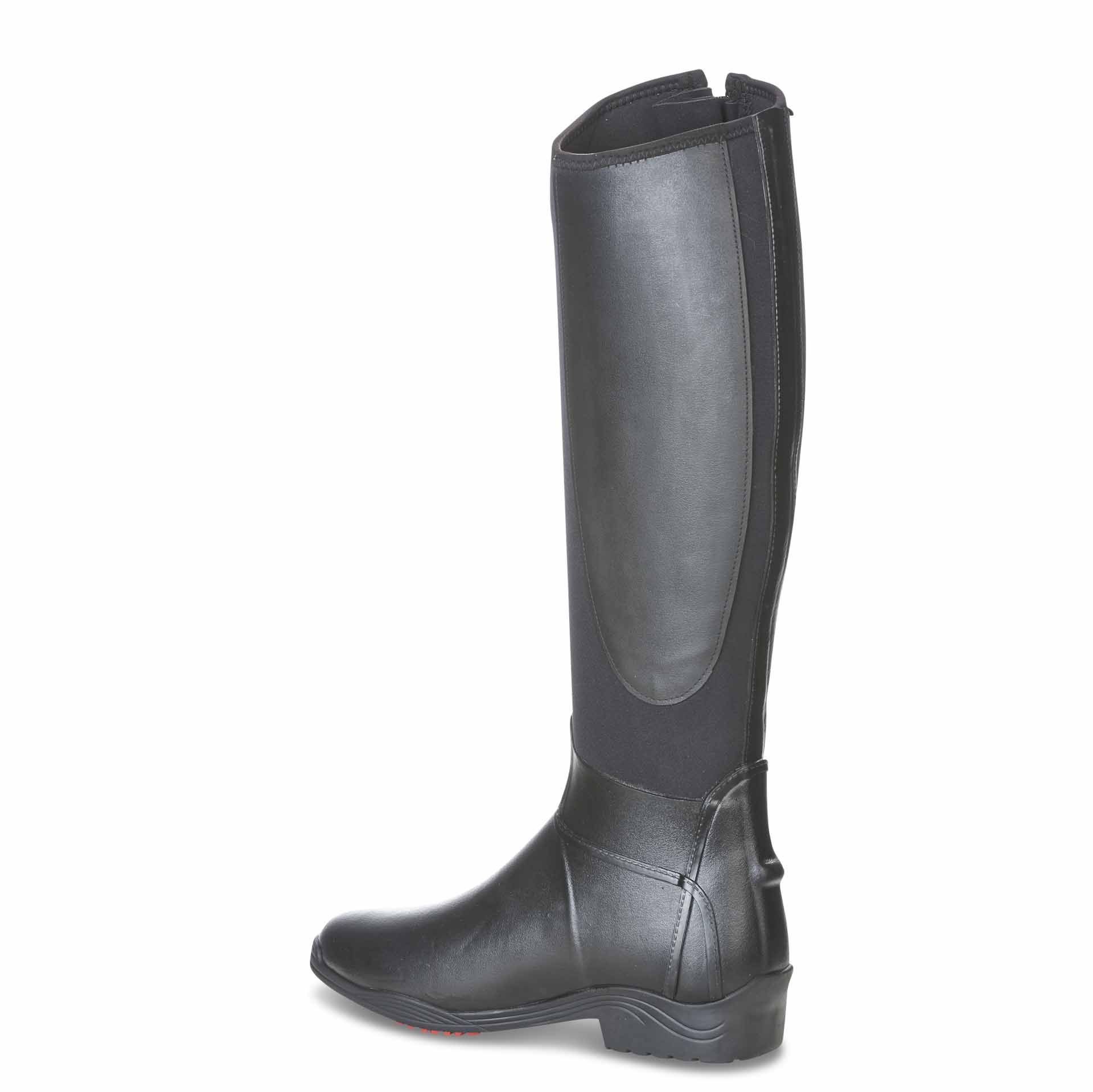 Dessa lera stövlar erbjuder en mängd speciella egenskaper och fördelar. De har ett anatomiskt förformat ridstopp från ett 5 mm tjockt, vattentätt neopren med den ömma änden under knäet, vilket förhindrar att hö och halm kommer in i bagageutrymmet. Tack vare neoprens självelasticitet erbjuder bagageutrymmet en optimal kalvpassage, oavsett kläder under.