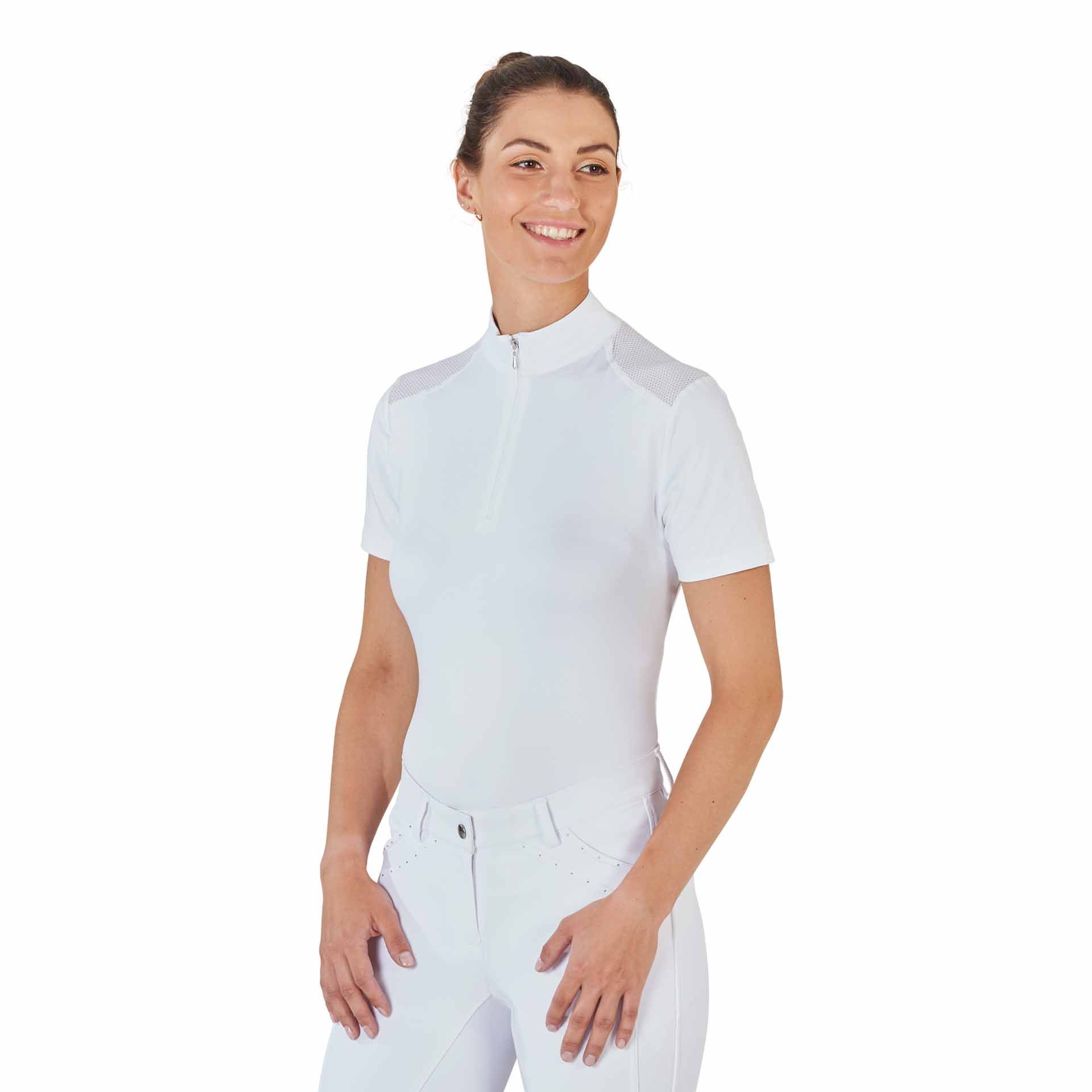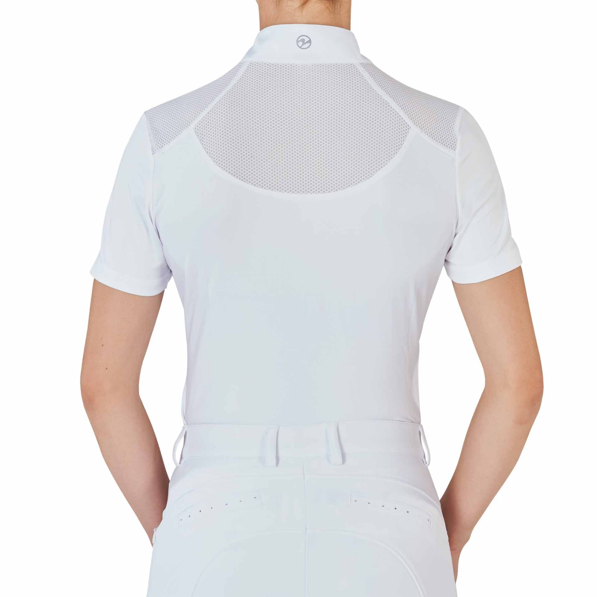 Skjortan är lätt att ta hand om, snabbt torka och frysa, vilket gör den till en praktisk följeslagare i hästsporter. Den består av 93% polyester (mikro) och 7% Elasthan.