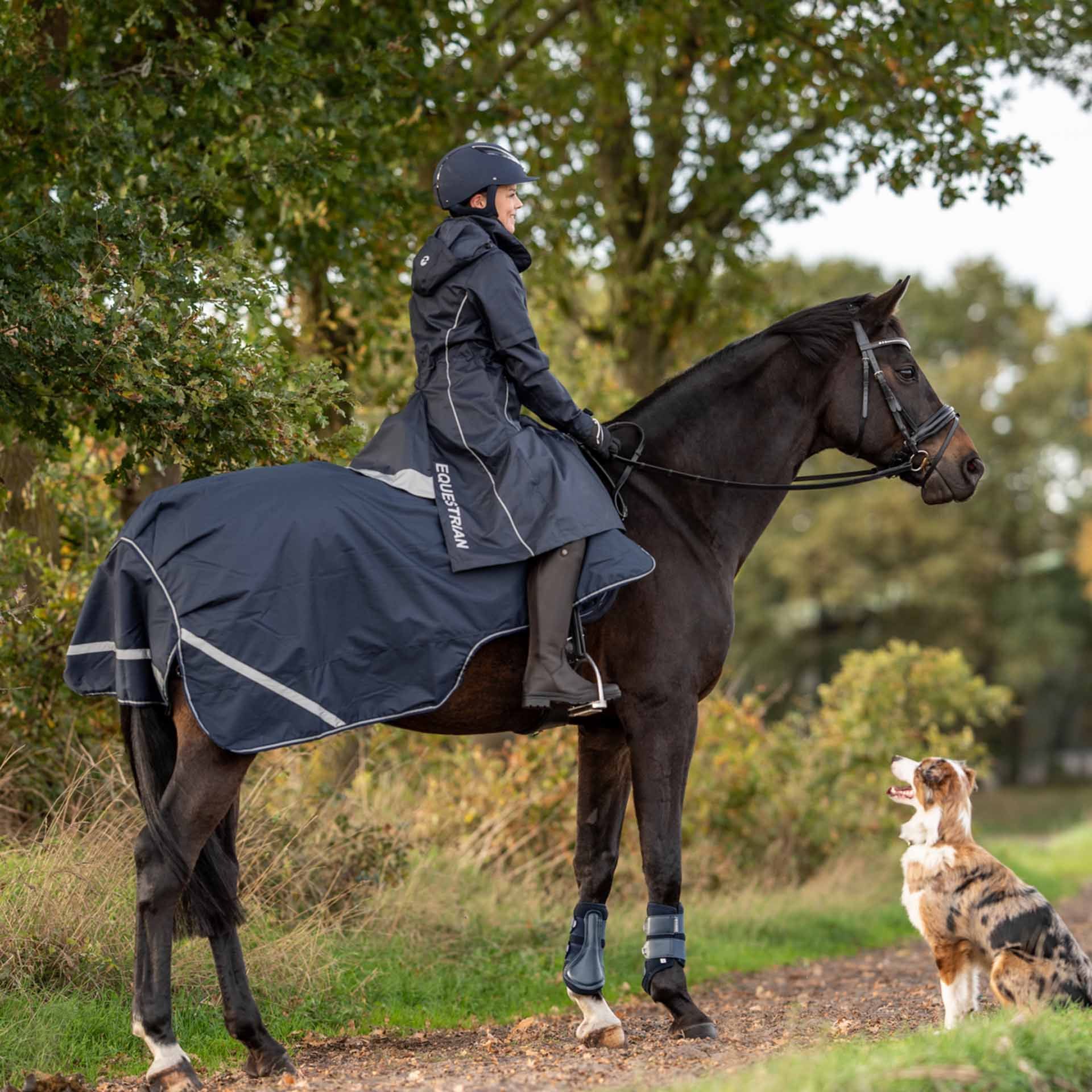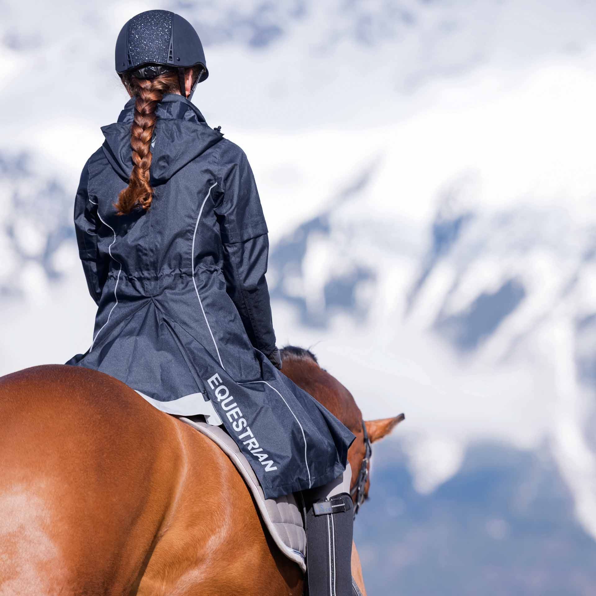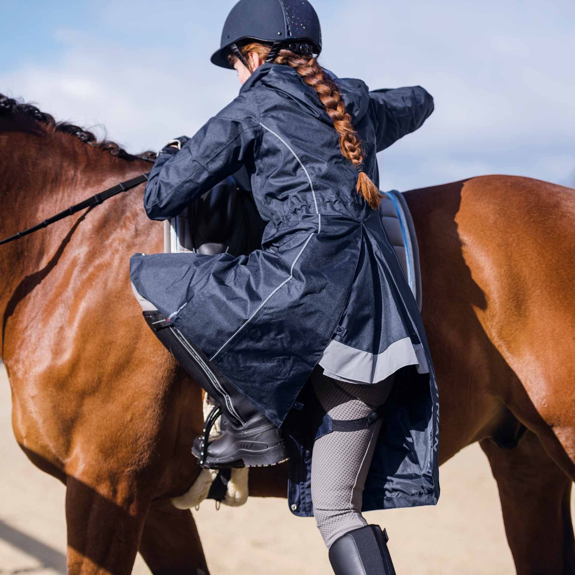 bussar Riding Coat Signy har en lång risplats med integrerat regnskydd gjord av reflekterande material som skyddar sadeln och säkerställer mer synlighet. Elastiska benslingor håller pälsen på låret när du rider/skyddar i vind. Dessutom kan ärmreflektorer anpassas individuellt och det finns ytterligare reflekterande detaljer för bättre synlighet.
