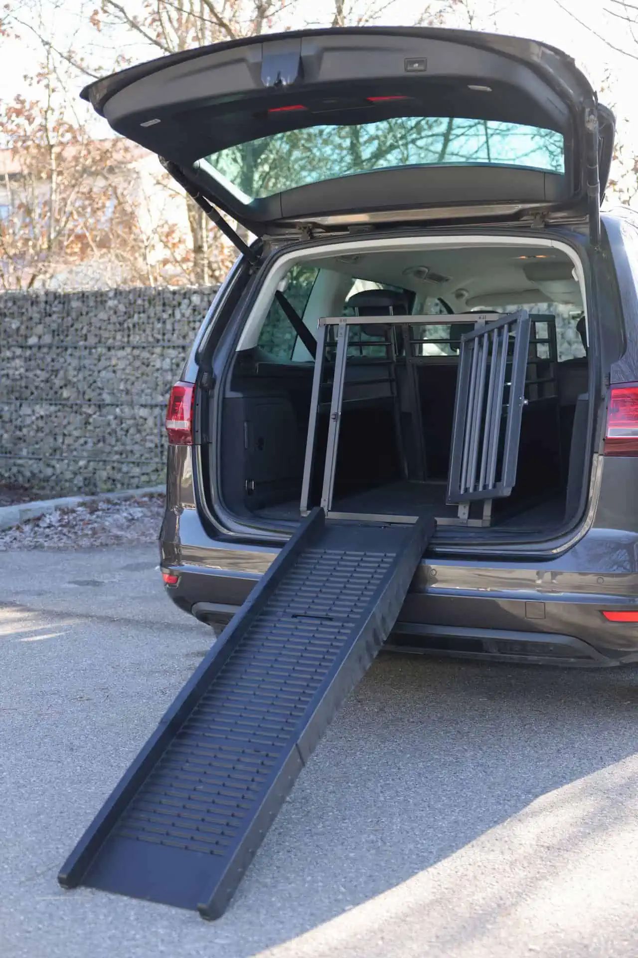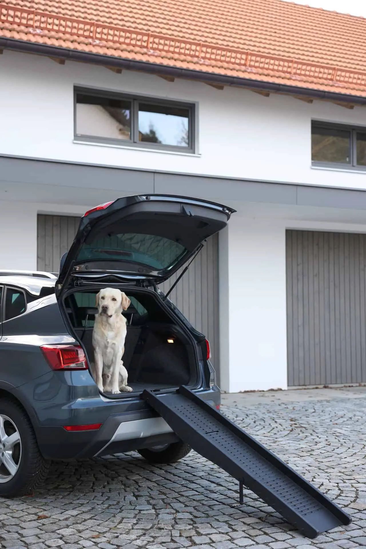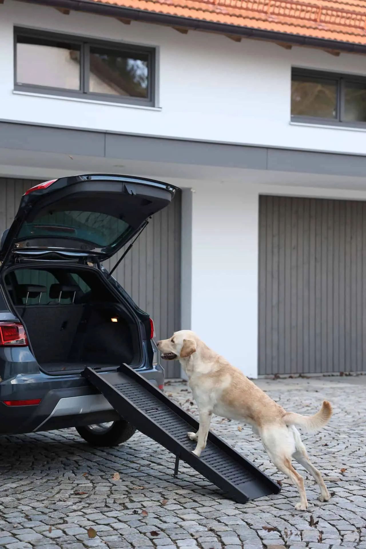 Rampens slitbanan är profilerad, vilket förhindrar bilder och möjliggör en säker ökning för din hund. En ökad sidokant erbjuder ytterligare säkerhet och förhindrar att djuret glider.