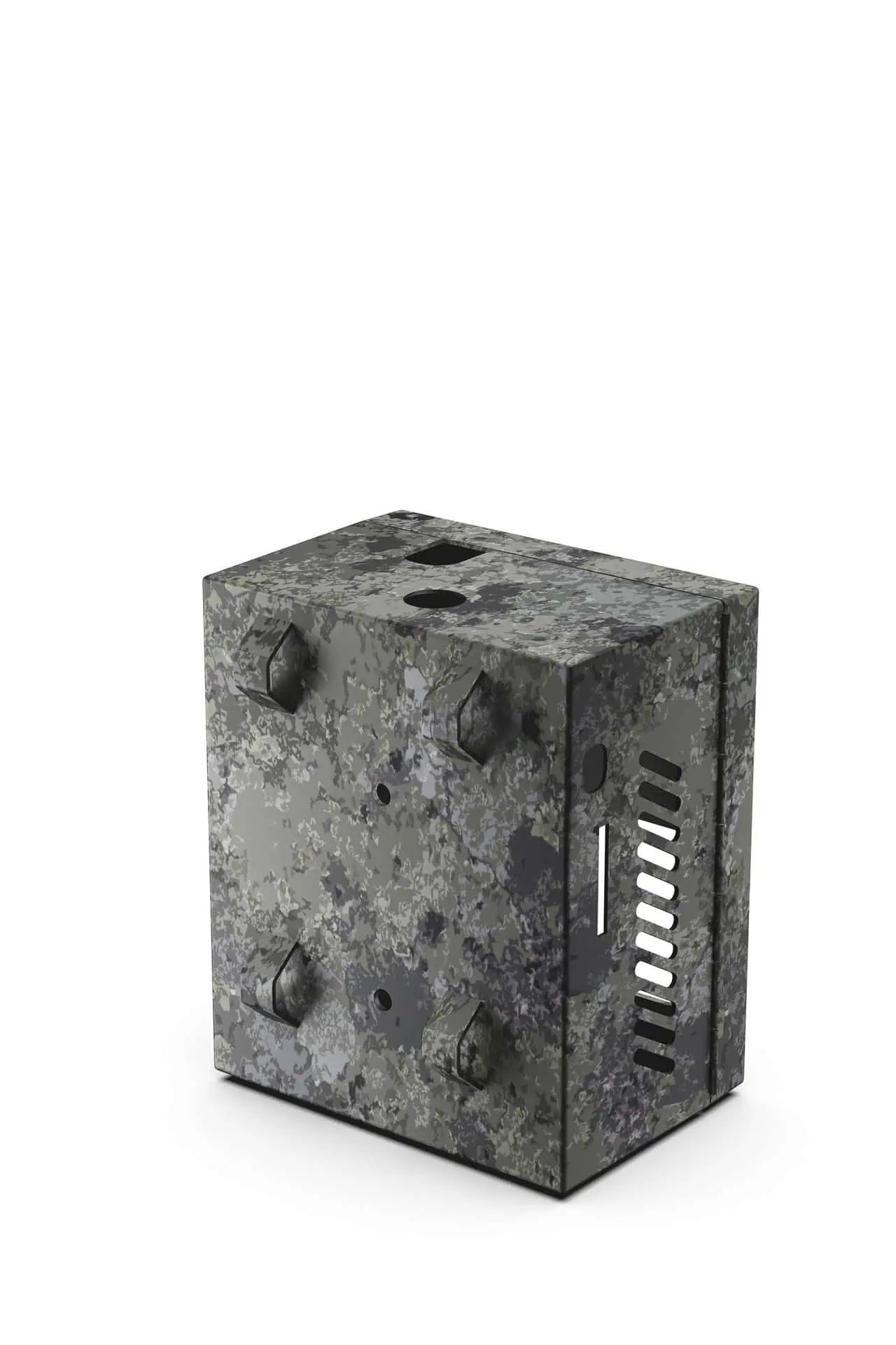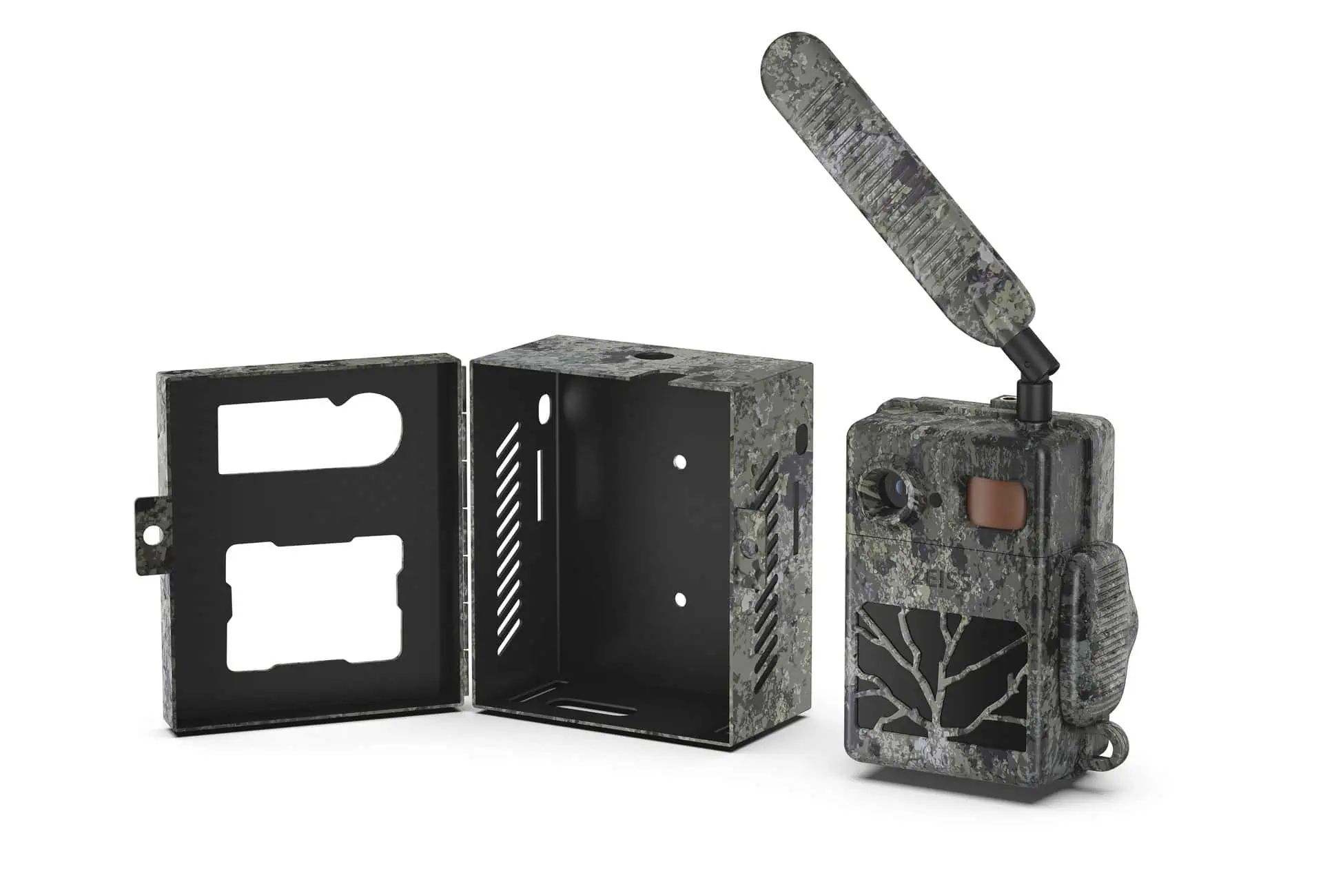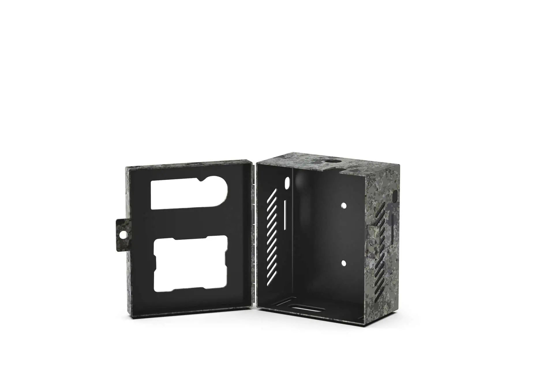 Metallhöljet är tillverkat av ett robust material som är hållbart och motståndskraftigt. Med två standardstativgängöppningar på baksidan underlättas enkel och säker installation. Kamerorna kan enkelt fästas på träd eller andra föremål med hjälp av stativfästen och säkras med ett standardkabellås genom öglorna på baksidan.