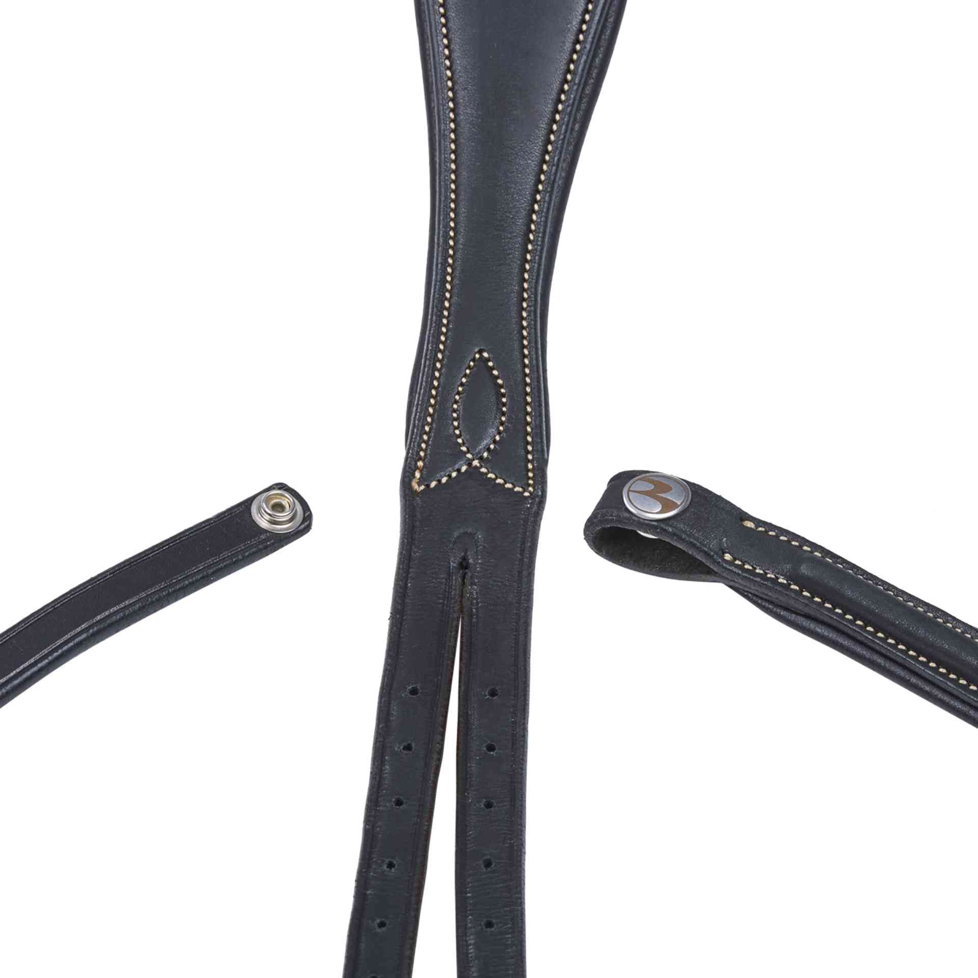 Experience bridle at a new level with the BUSSE Bridle TAKE-OFF LINE AS! The anatomically cut and softly padded headpiece offers optimal pressure distribution with its wide headpiece and ensures maximum wearing comfort. The elaborate decorative stitching is a testament to timeless style and sporting passion. Thanks to its modern and flexible design, the noseband and throatlash can be completely removed and reattached in the blink of an eye.