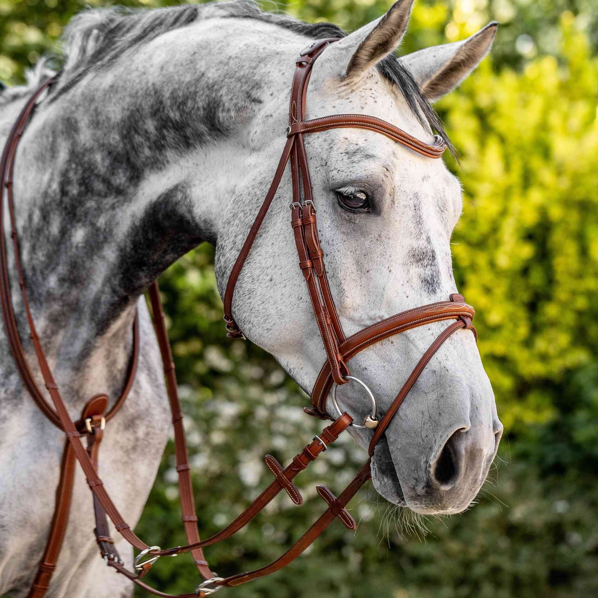 Particularly noteworthy is the manufacture from high-quality American leather, which is known for its exceptionally high quality and soft feel. This leather is mostly vegetable-tanned, ensuring sustainable production and long-lasting durability. The martingale fits comfortably against the horse's coat and stands out with its high-quality stainless steel fittings.
