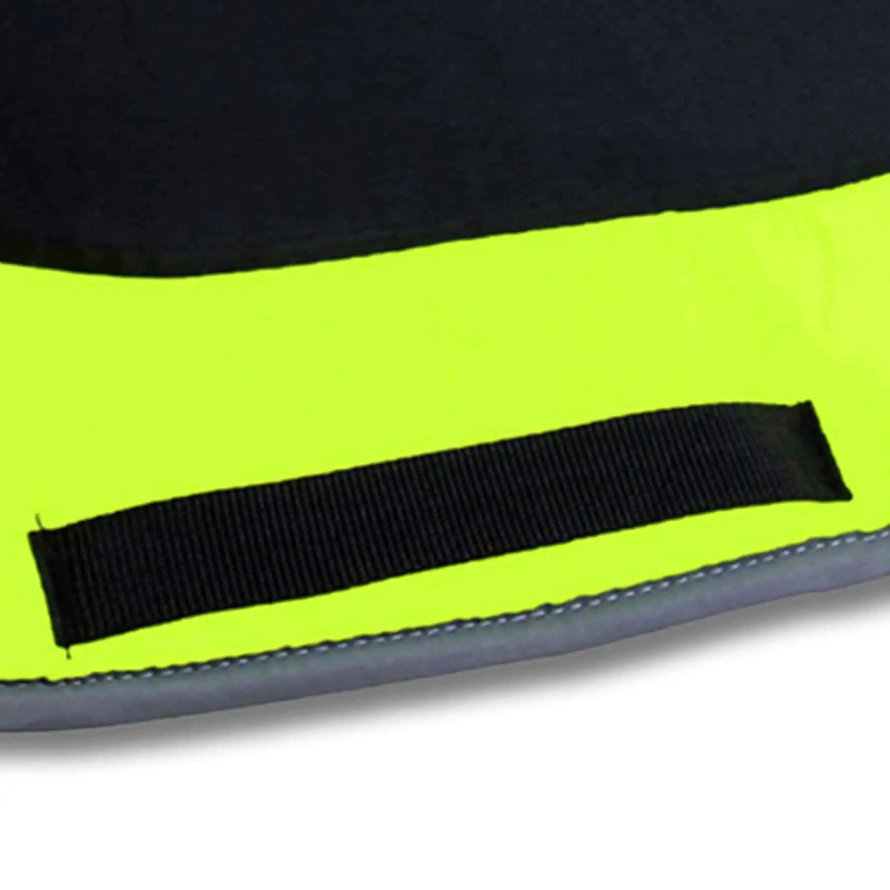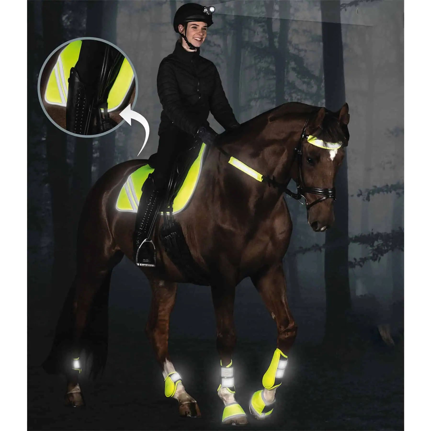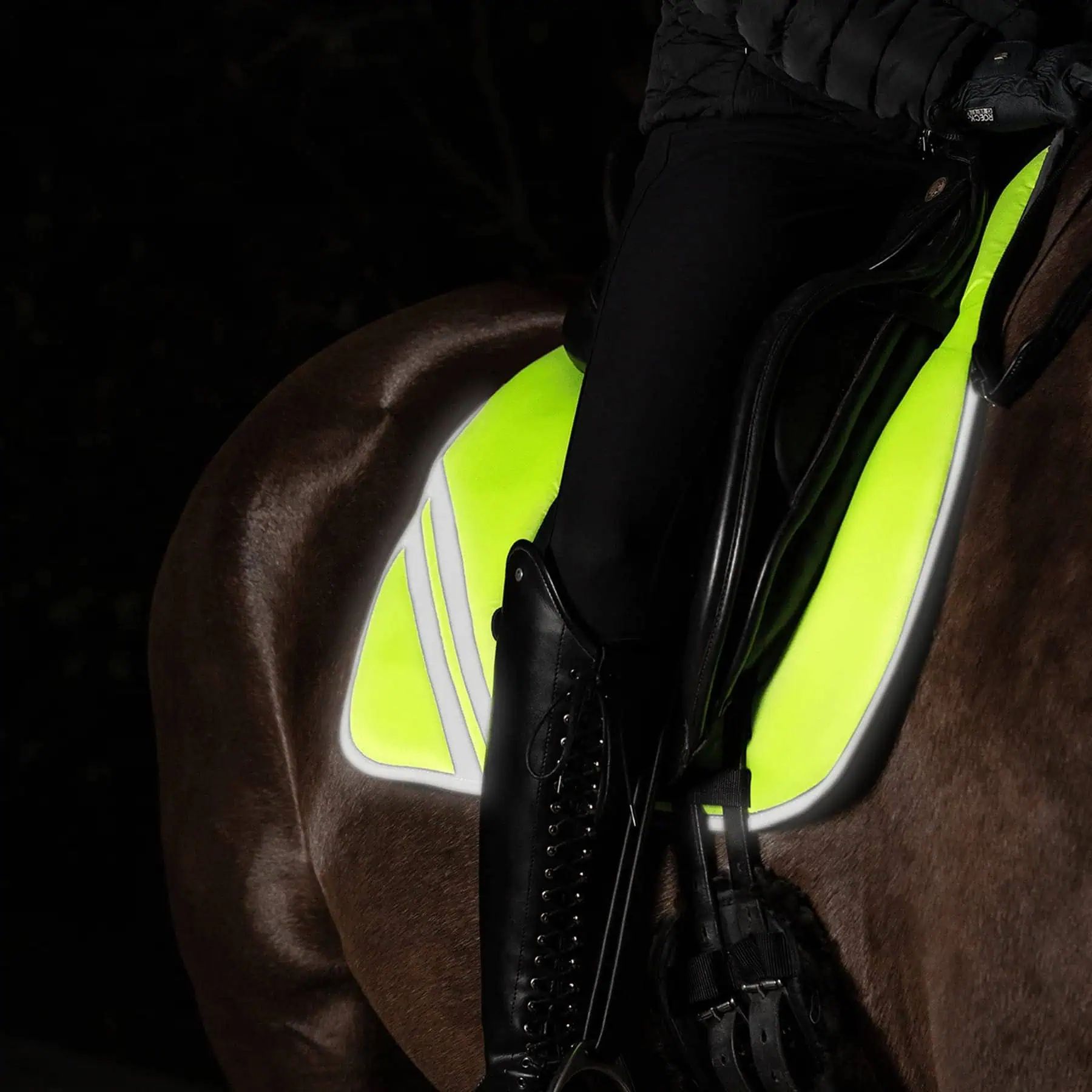 Neon yellow outer material, softly padded with skin sensitive lining, provides added security for horse and rider. The saddle pad is finished with a reflective binding and two reflective stripes on both sides. Strap loops with touch tape.