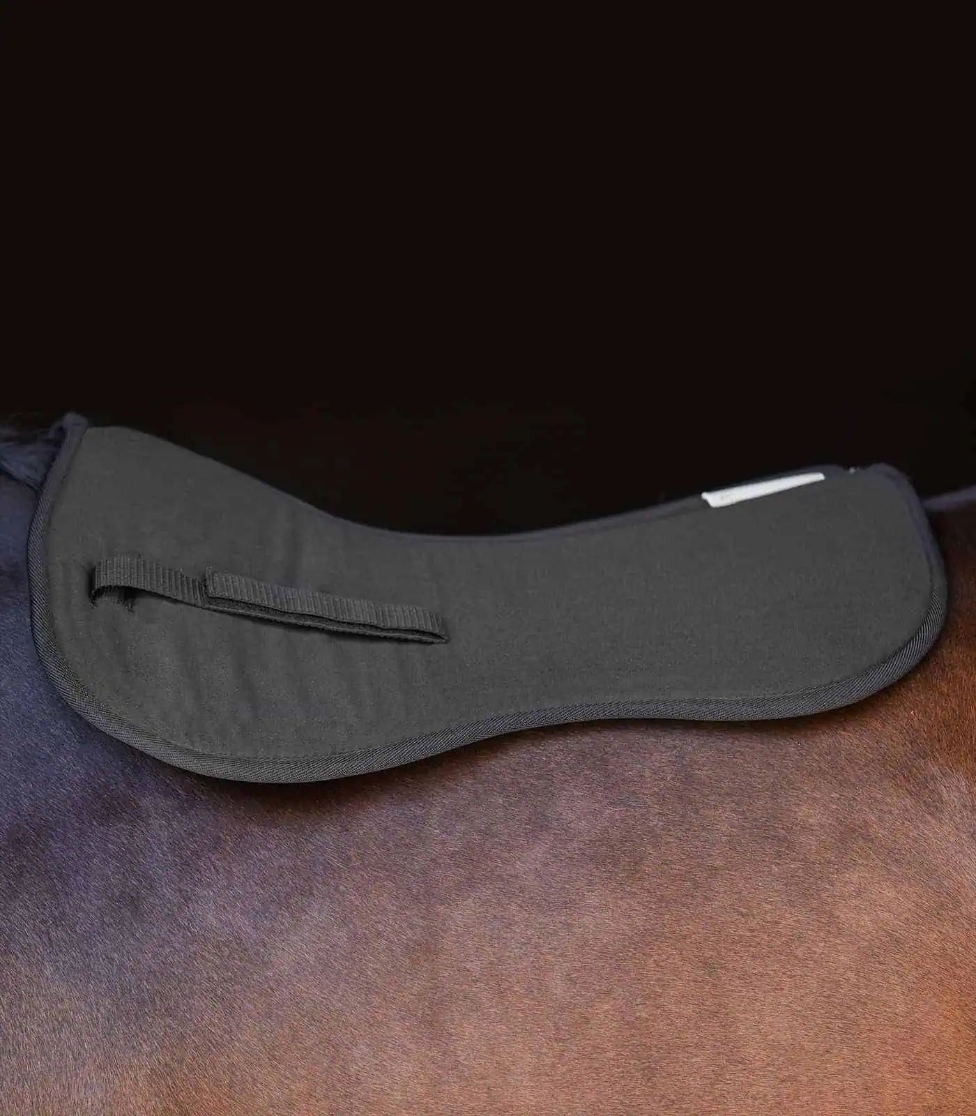 Shock-absorbing saddle pad with hardwearing outer material. The memory foam filling adjusts itself optimally to the horse"s back and provides protection from pressure points. Slight problems in the saddle"s fit are neutralized. With girth loops.