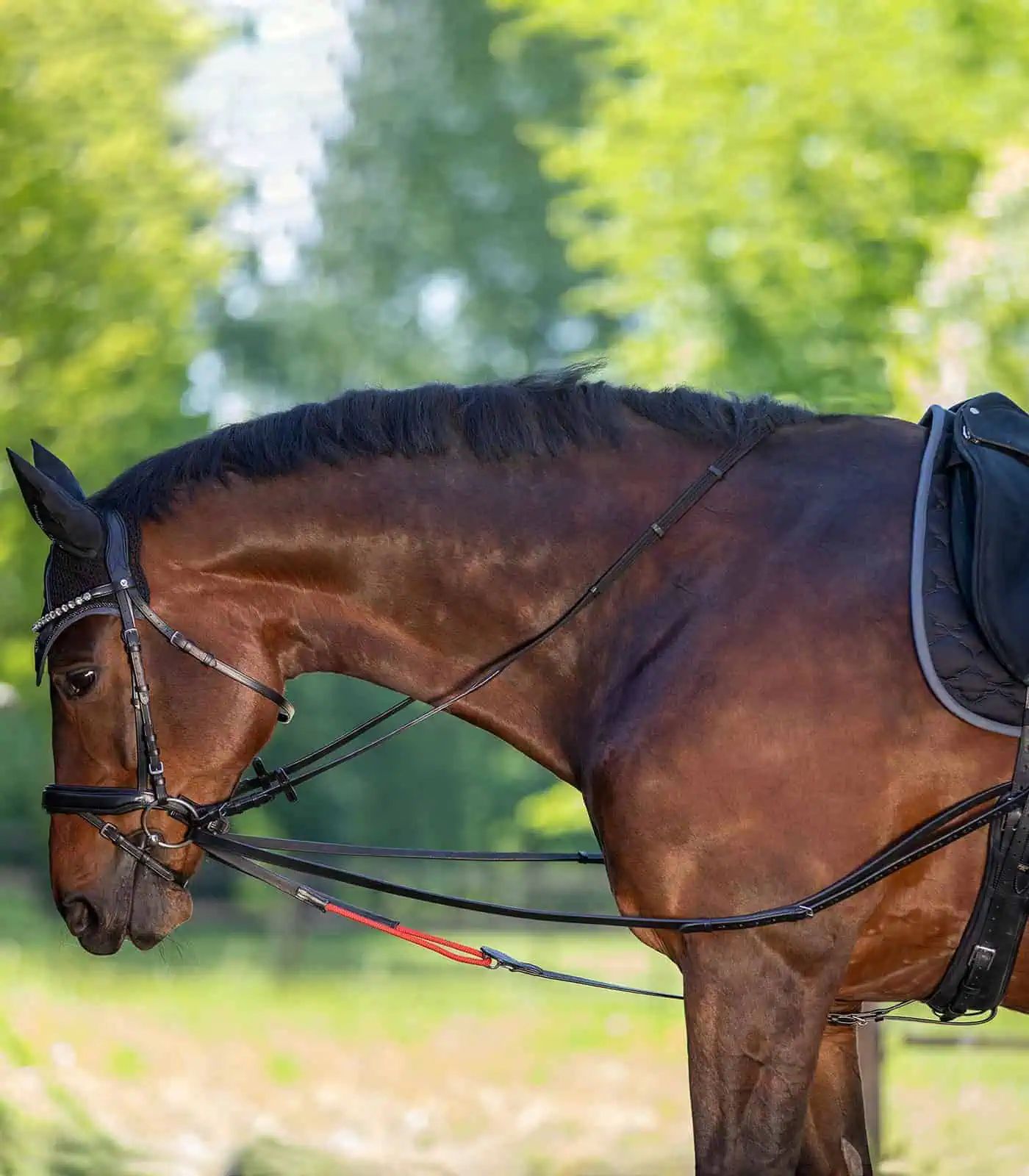 Innovative length-adjustable and flexible leather draw reins for riding or lunging. The W-trainRein draw reins are attached to the girth or surcingle between the forelegs. A special rein runs through a guide roller and is taken from there through the respective bit ring (from the inside to the outside) back to the girth or surcingle. The guide roller gives the reins and facilitates a gentle and mouth-friendly bending and suppling whilst riding or lunging.