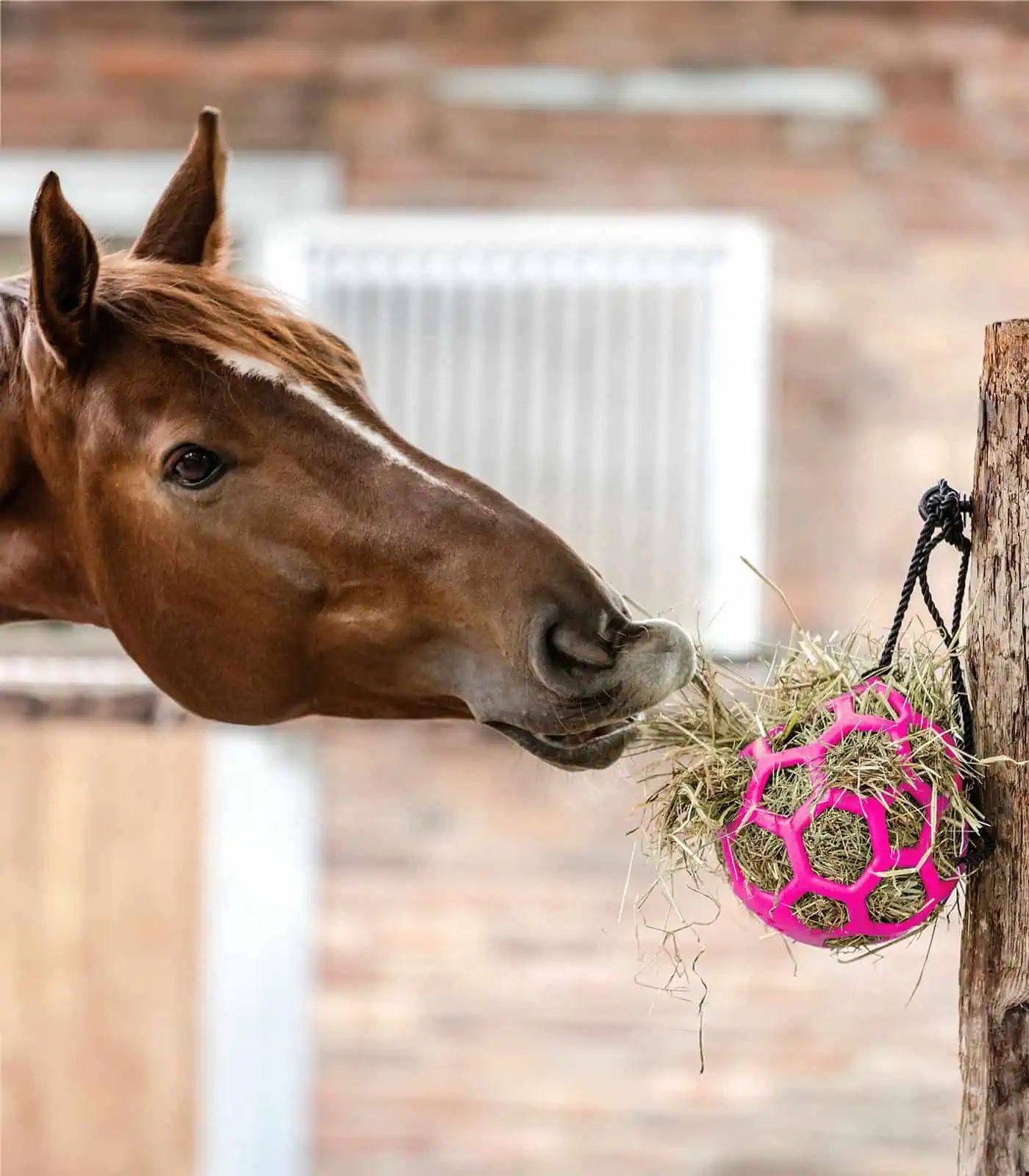 The Waldhausen hay ball is ideal for preventing boredom and slowing down and rationing hay intake. This is particularly gentle for the stomach and also keeps the horse entertained for hours. The ball can easily be filled with hay and other treats, e.g. carrots and apple pieces, and hung up using the 2 m long strap supplied. It is made entirely of thermoplastic rubber, which makes it particularly flexible and durable.