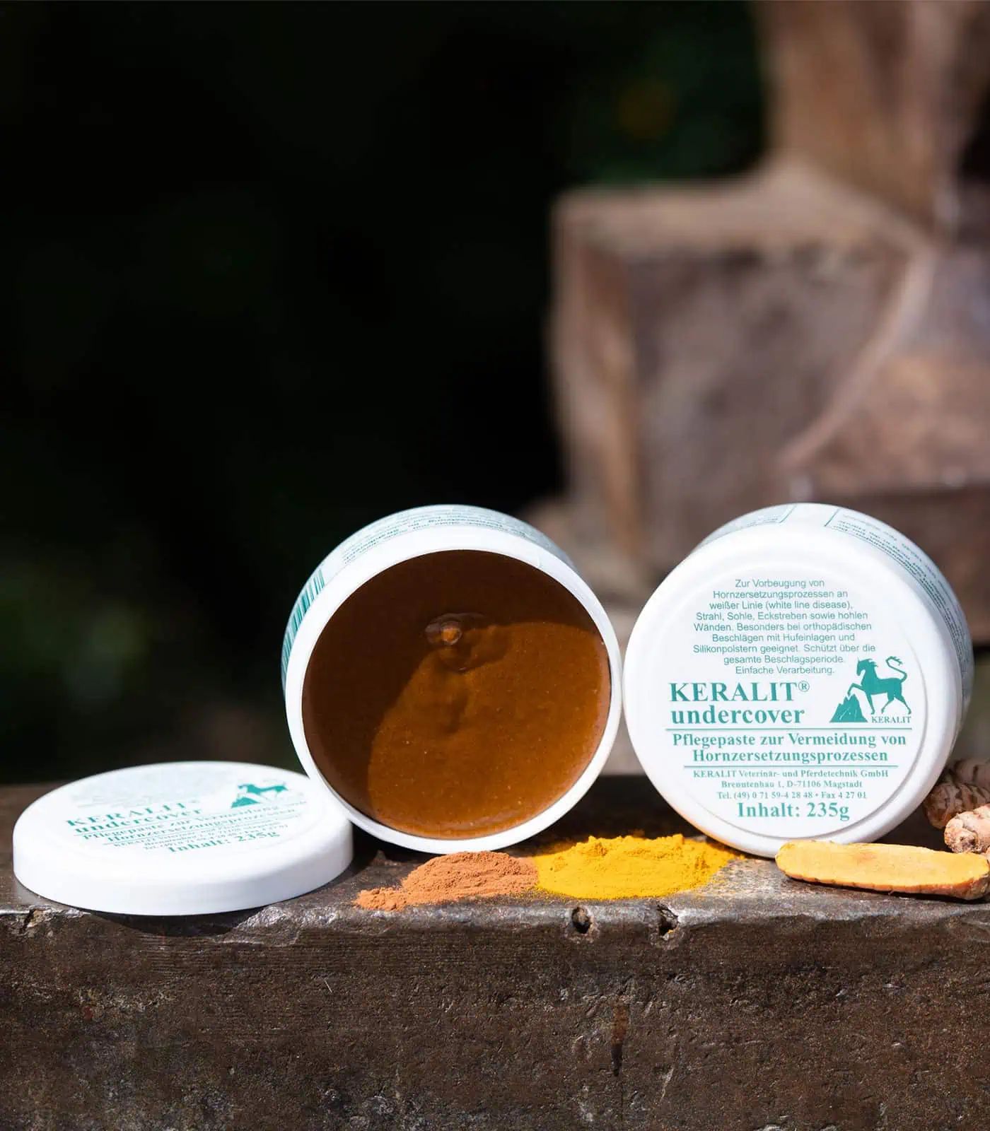 KERALIT Undercover is a nourishing paste to prevent horn disintegration processes at the white line, frog, sole, bars as well as hollow walls. The paste is ideal for horses that are kept in open stables and often stand on wet ground! KERALIT Undercover creates a constant, thrush-inhibiting environment where it is applied. It is particularly suitable when orthopaedic shoes with hoof inserts and silicone pads are in use. Protects throughout the entire period the shoes are in place. KERALIT Undercover can be used by farriers, barefoot trimmers and horse owners.