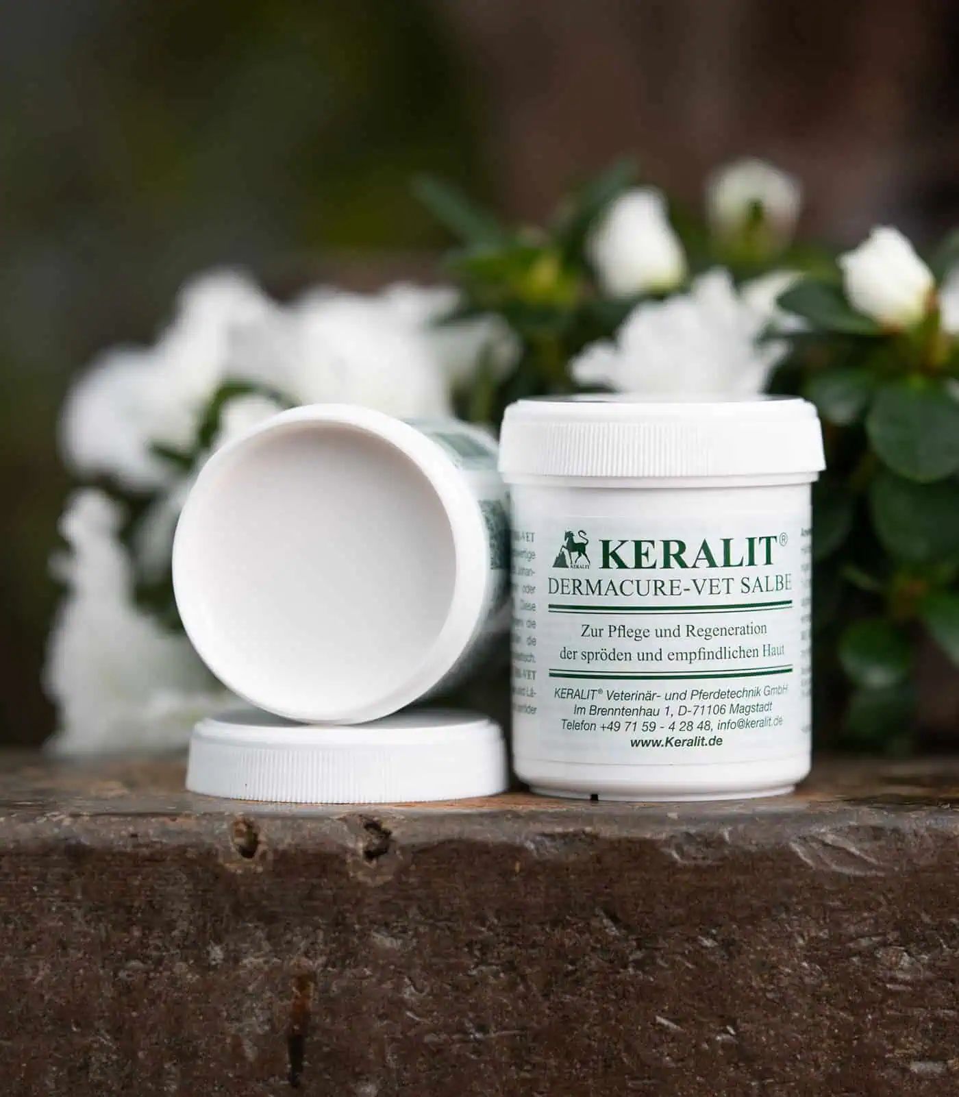 With mallenders and eczema, the affected skin areas are often brittle and irritated. KERALIT Dermacure ointment contains high quality, nourishing substances such as dexpanthenol, St. John"s wort oil and zinc oxide. These support the regeneration of the irritated skin areas. Nourishing substances keep the skin supple and elastic, thus preventing it from cracking again. KERALIT Dermacure Ointment is a useful supplement to KERALIT Keralysin Ointment for aftercare.