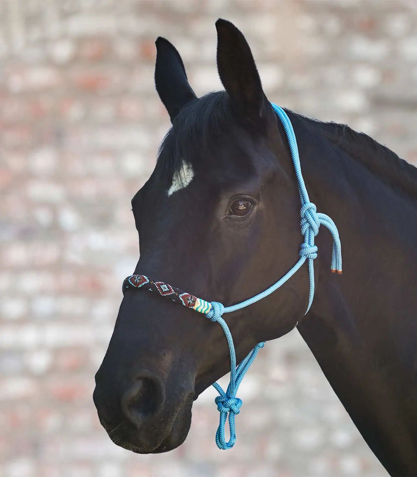 Chic knotted halter with double headpiece and double noseband. Thickness of the cord 8 mm. Beautiful design with pearls on the noseband.