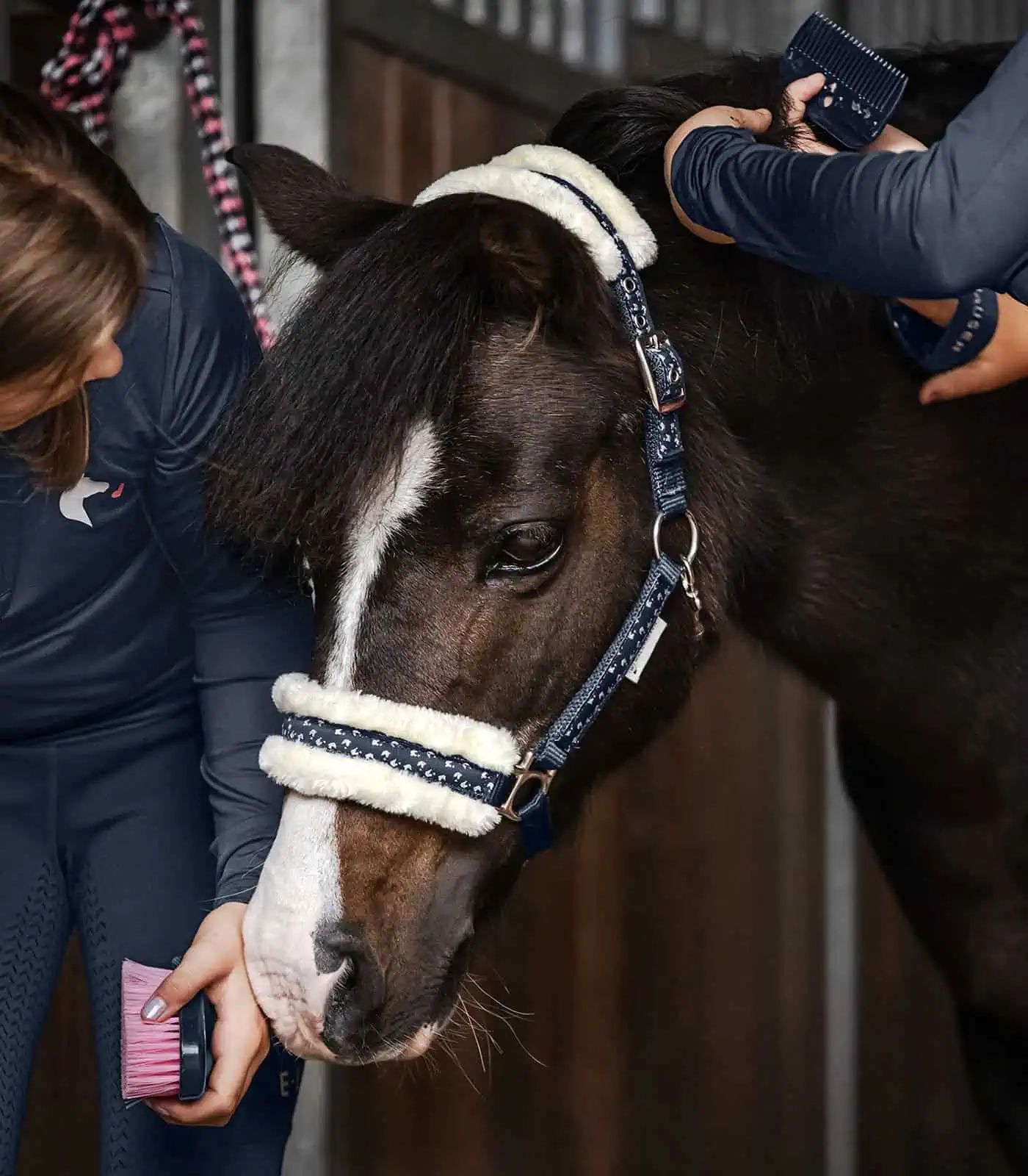 Set consisting in halter of cute all-over print and tricolour lead rope. The halter is padded with fur in the nose and neck area.