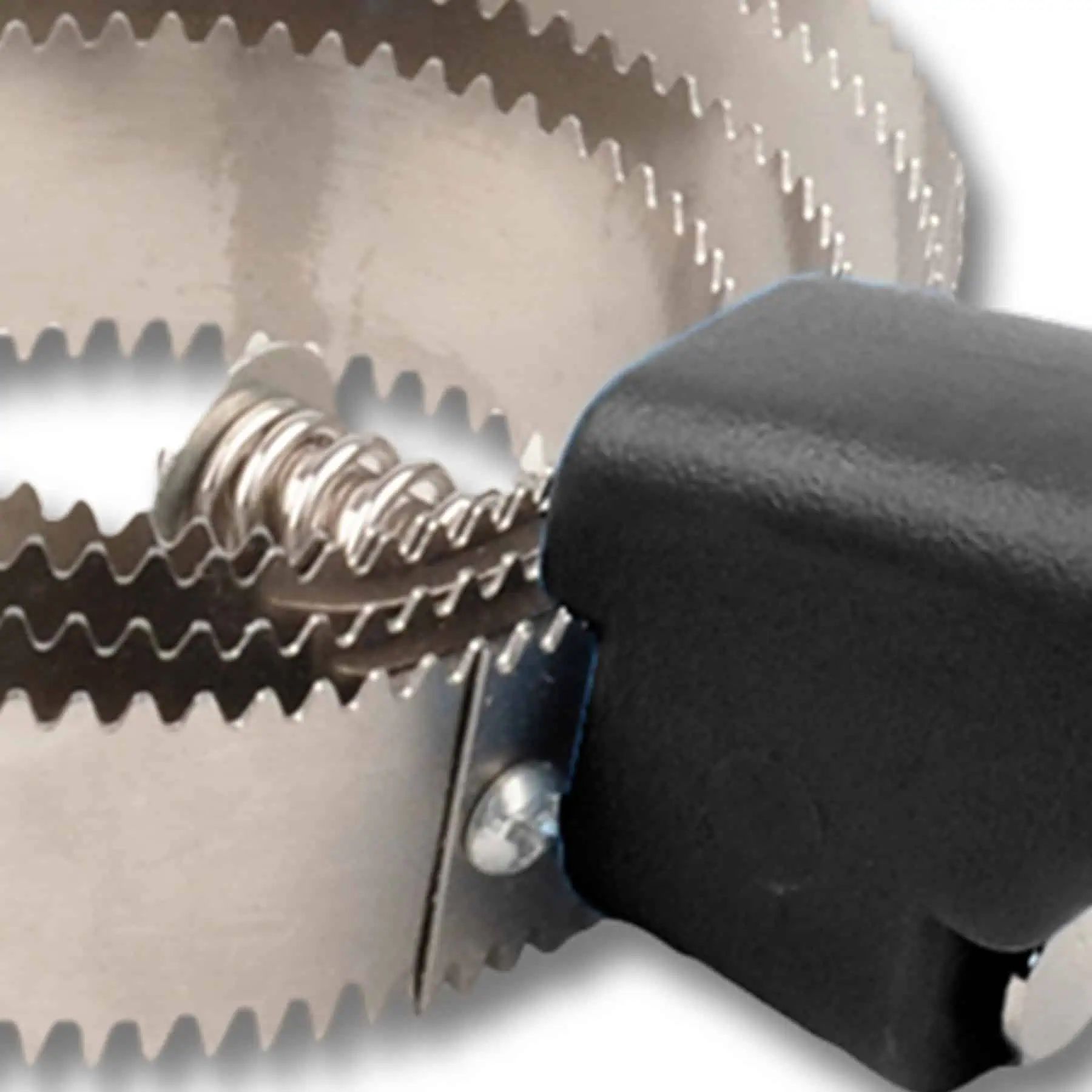 Features 4 stainless steel rings in two different strengths. Ideal for use during the horse"s change of coat or for brushing clotted coat. Plastic handle.