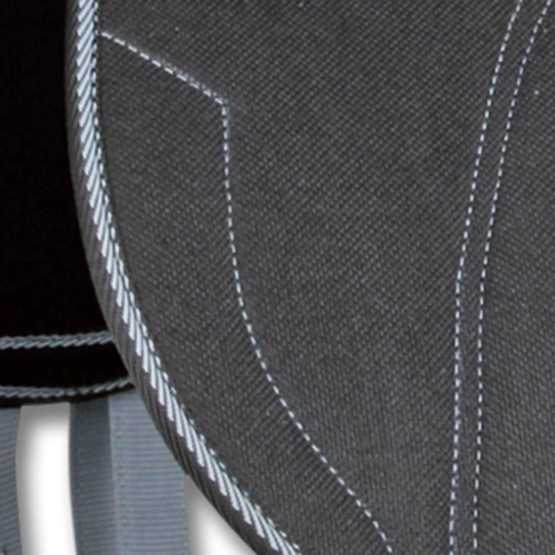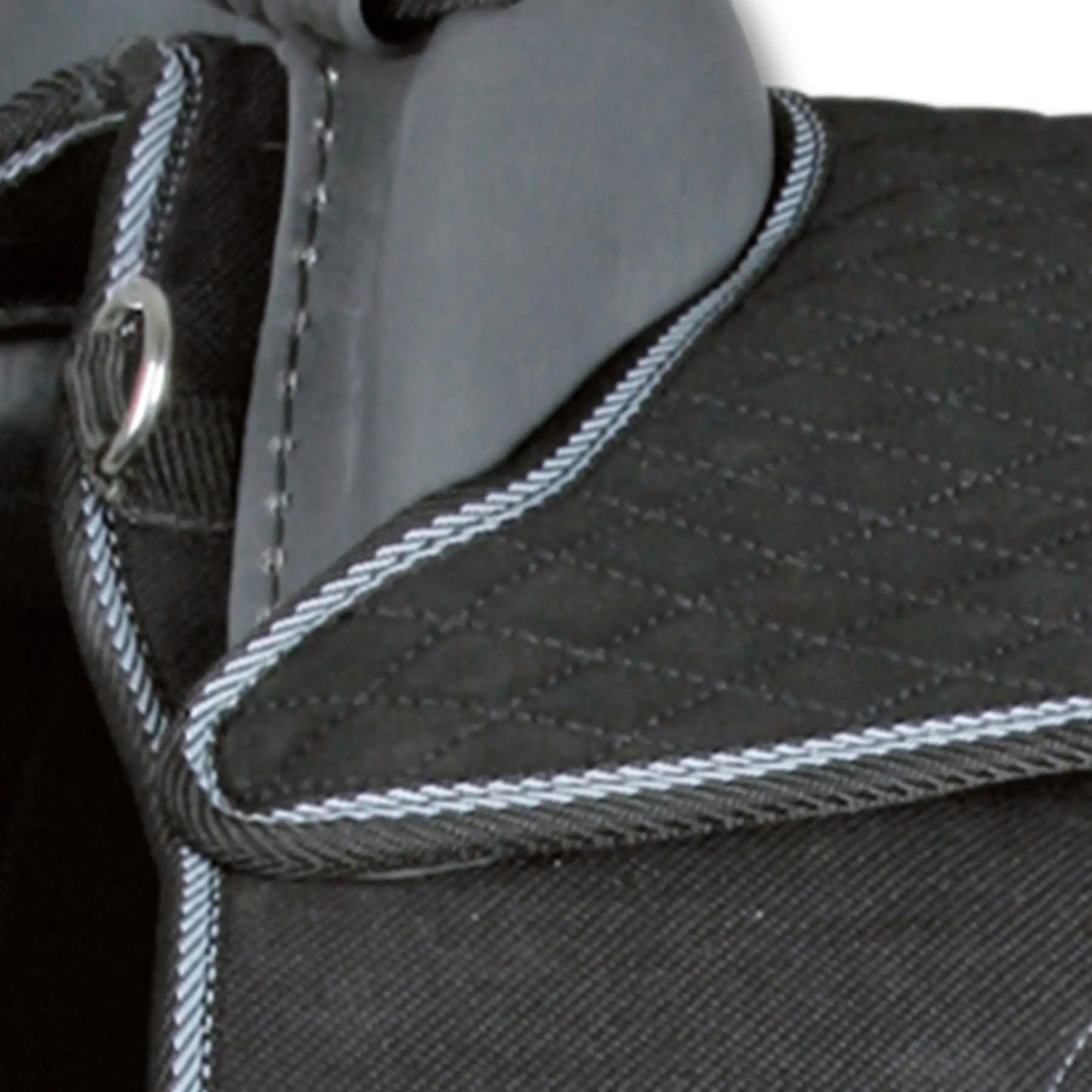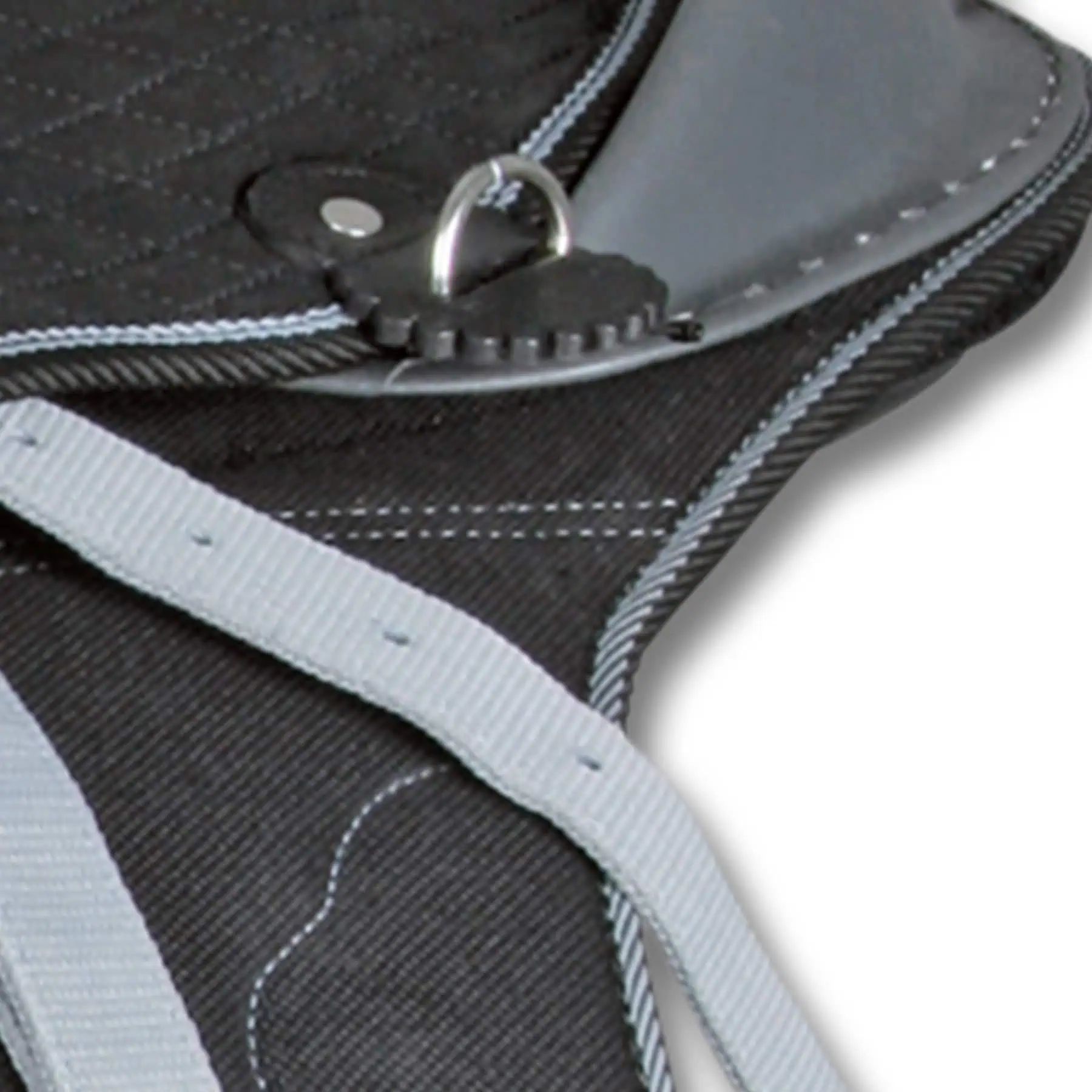Lightweight riding pad for the little ones. Softly padded, front and back cut higher for a good seat. Non-slip, rubberised, grab strap for holding on. Gullet width variable by means of repositionable saddle pads. Adjustable knee rolls at front with touch tape, crupper ring, hardwearing nylon straps. Supplied with grab strap, girth, stirrup leathers and stirrups.