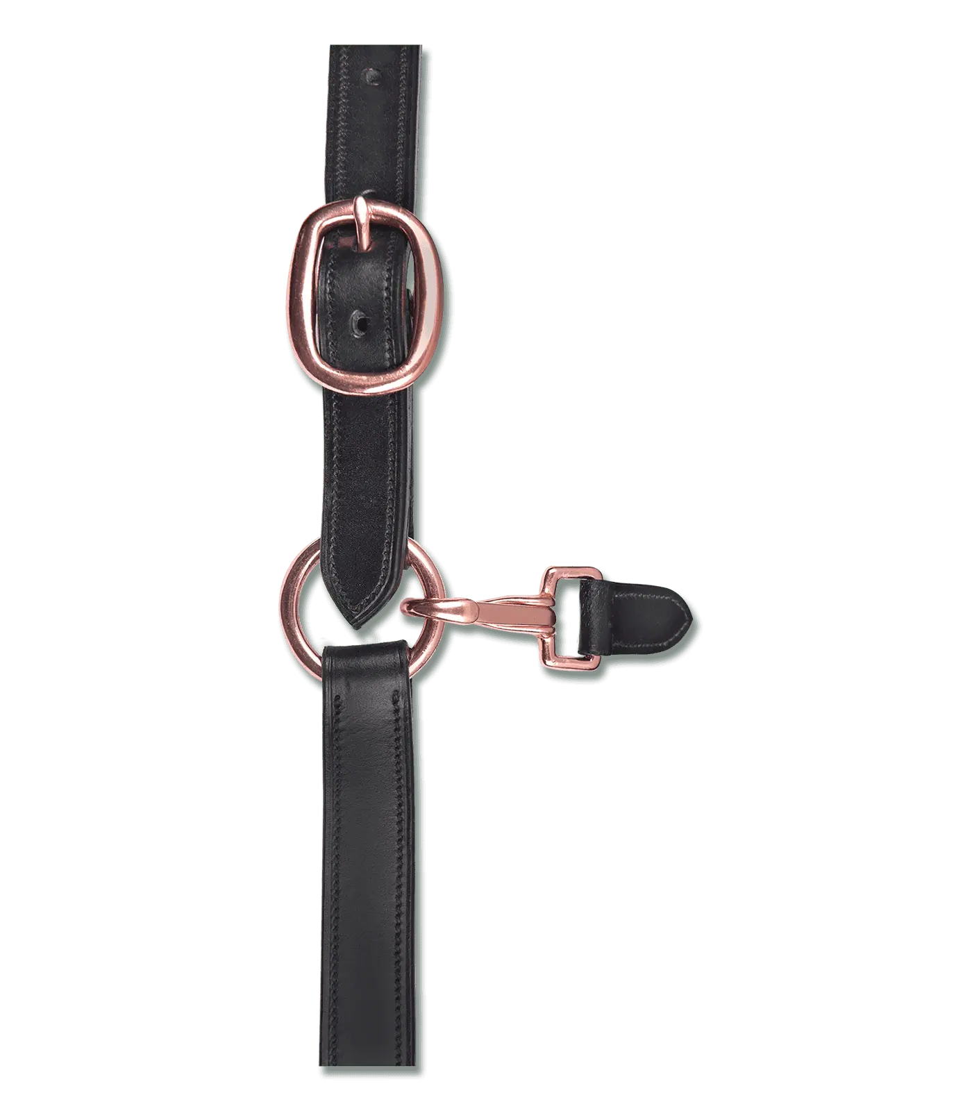 Classy leather halter featuring a padded noseband and headpiece as well as a rolled stitched throat lash. High quality rosé fittings. Headpiece adjustable on both sides, adjustable chinstrap.