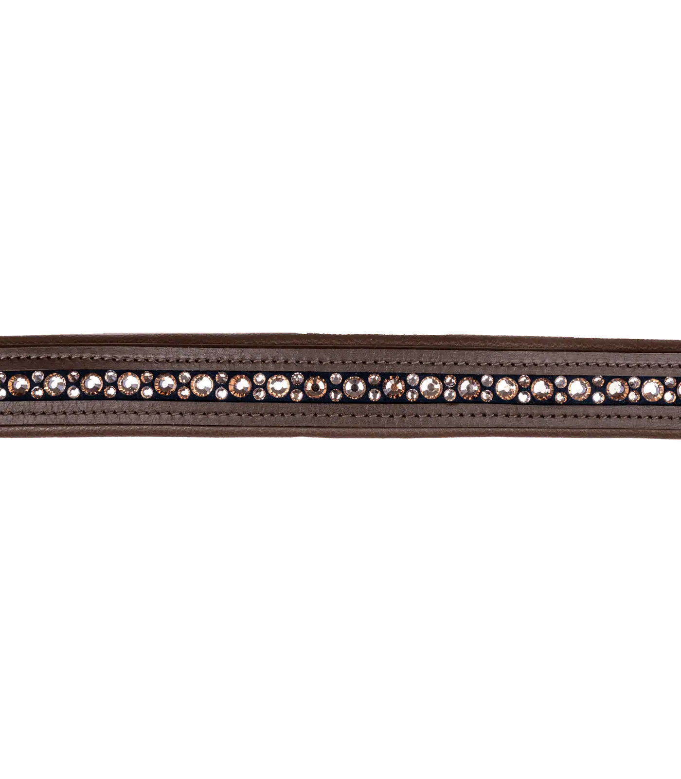 Elegant leather halter with softly padded noseband and headpiece. With decorative rhinestones on the noseband. Headpiece adjustable on both sides and easily adjustable chin strap.