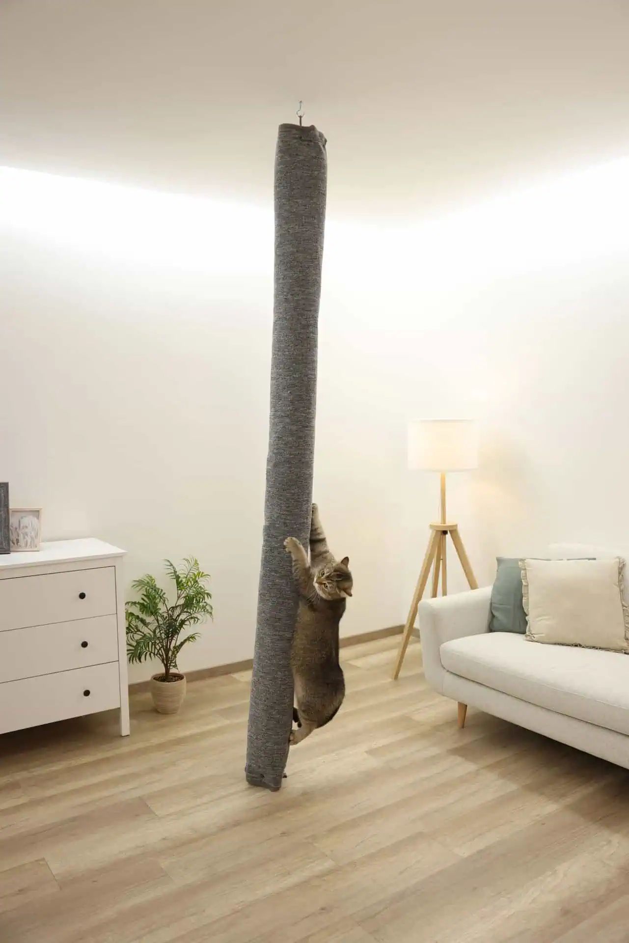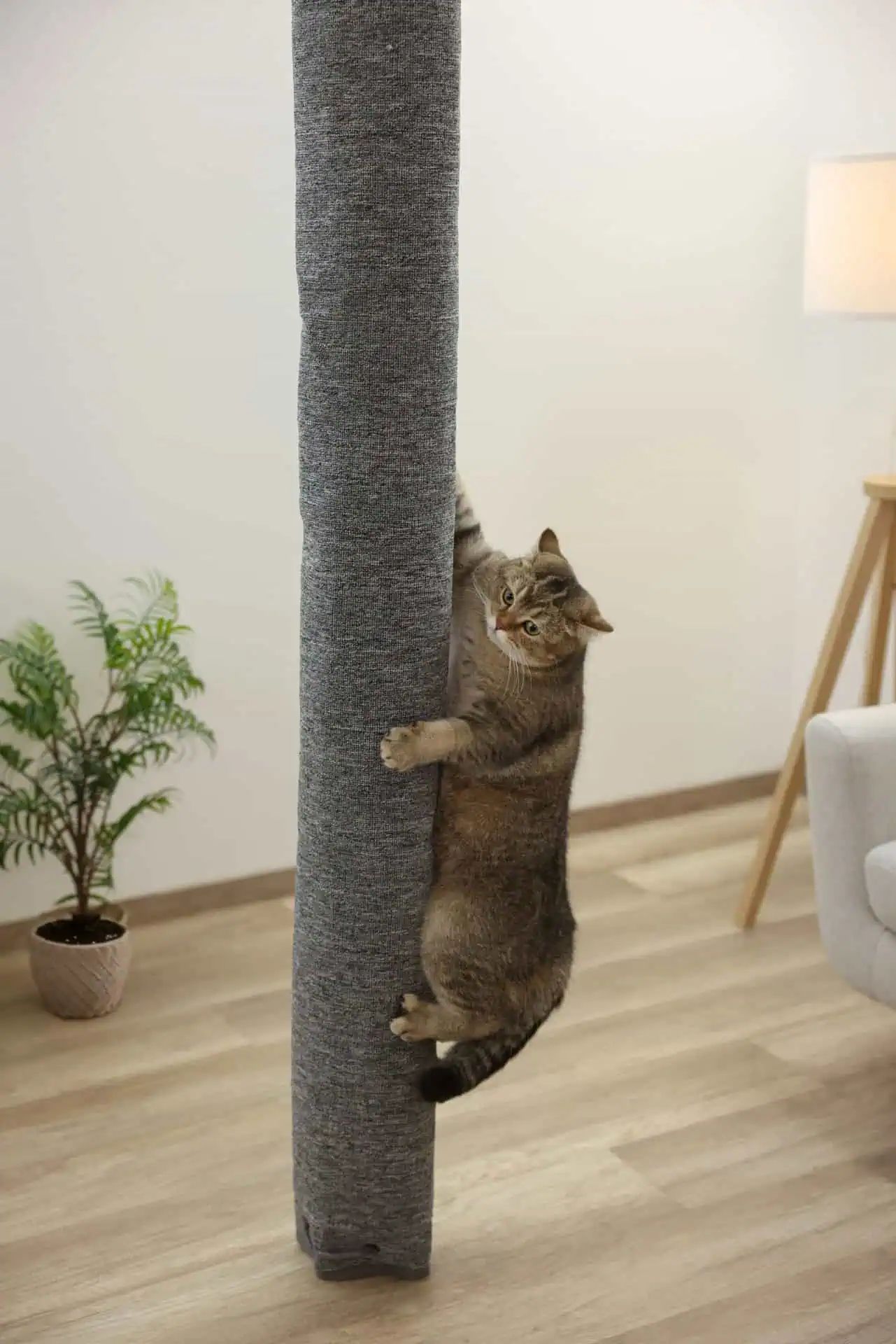 The Climbing Bag Carpet not only provides an ideal climbing spot for your cat, but also serves as a scratching surface for claw care, protecting your furniture and carpets from unwanted scratching attacks. Made from durable polyester carpet fabric and filled with padded cushions, the Climbing Bag is particularly long-lasting and resilient. Thanks to the variable fastening rope, the length can be individually adjusted, allowing the bag to be attached to ceilings, stairwells, or galleries. The Climbing Bag can also serve as a playful climbing aid for your cat to reach higher levels, e.g., in the stairwell or as an extension of existing climbing walls.