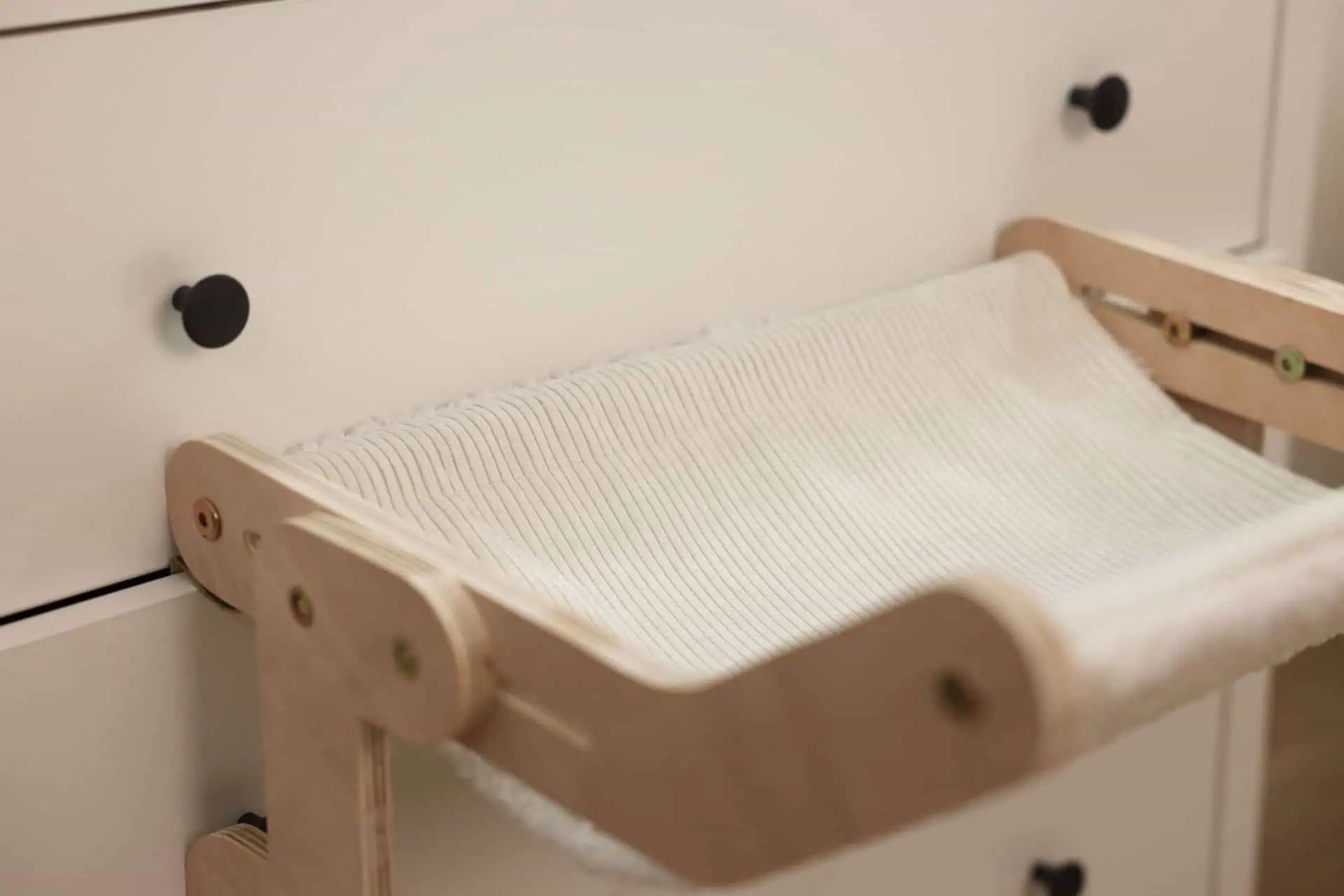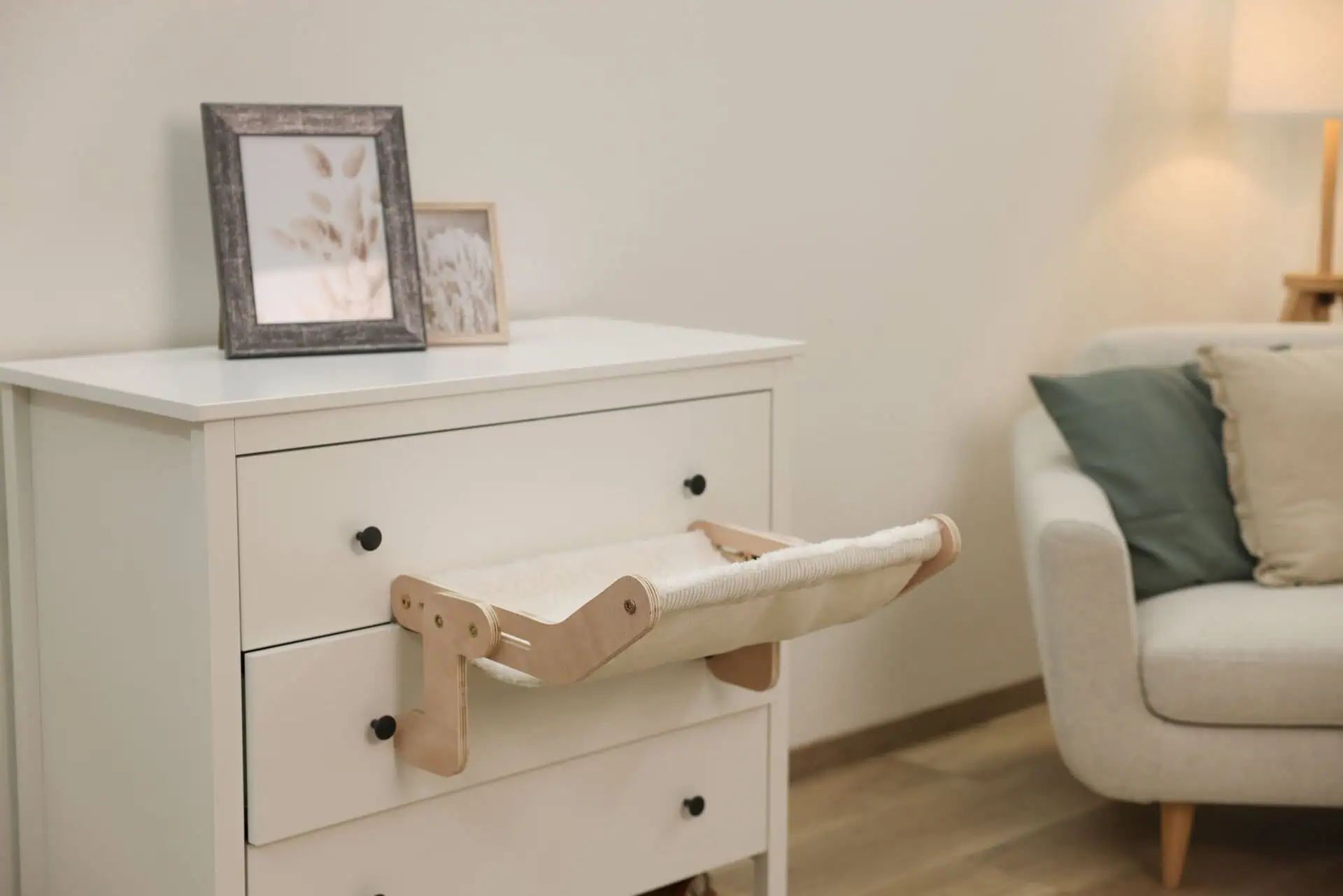 The Hammock Nap can be easily attached to beds, dressers, cabinets, and drawers. No drilling is required.