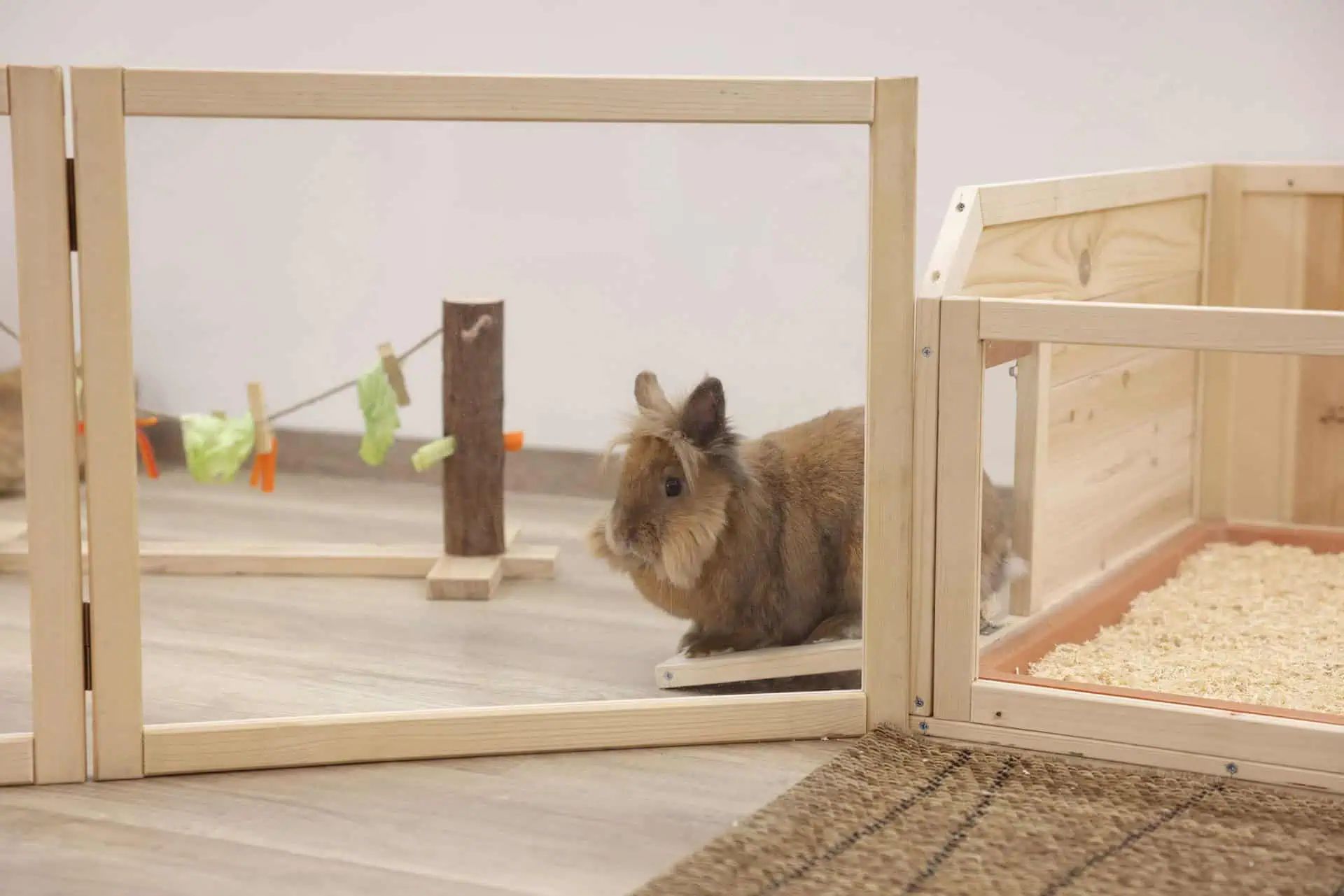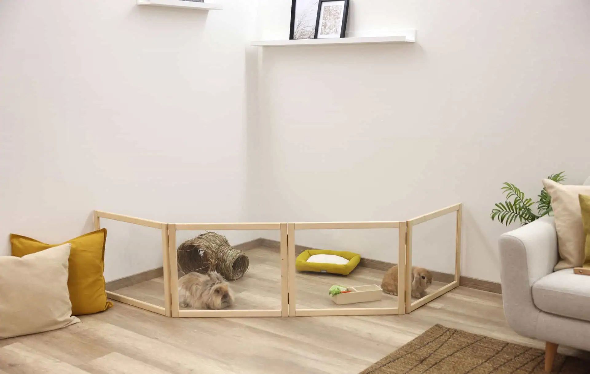 The Indoor Room Divider / Small Animal Run is the perfect solution for those who want to provide their small pets with a safe and luxurious place to play. Equipped with plexiglass walls, this run offers excellent visibility, allowing your animals to explore their surroundings without hiding. The run serves not only as a play area but also as a flexible room divider and barrier in front of furniture, cables, or plants to prevent chewing or hiding.