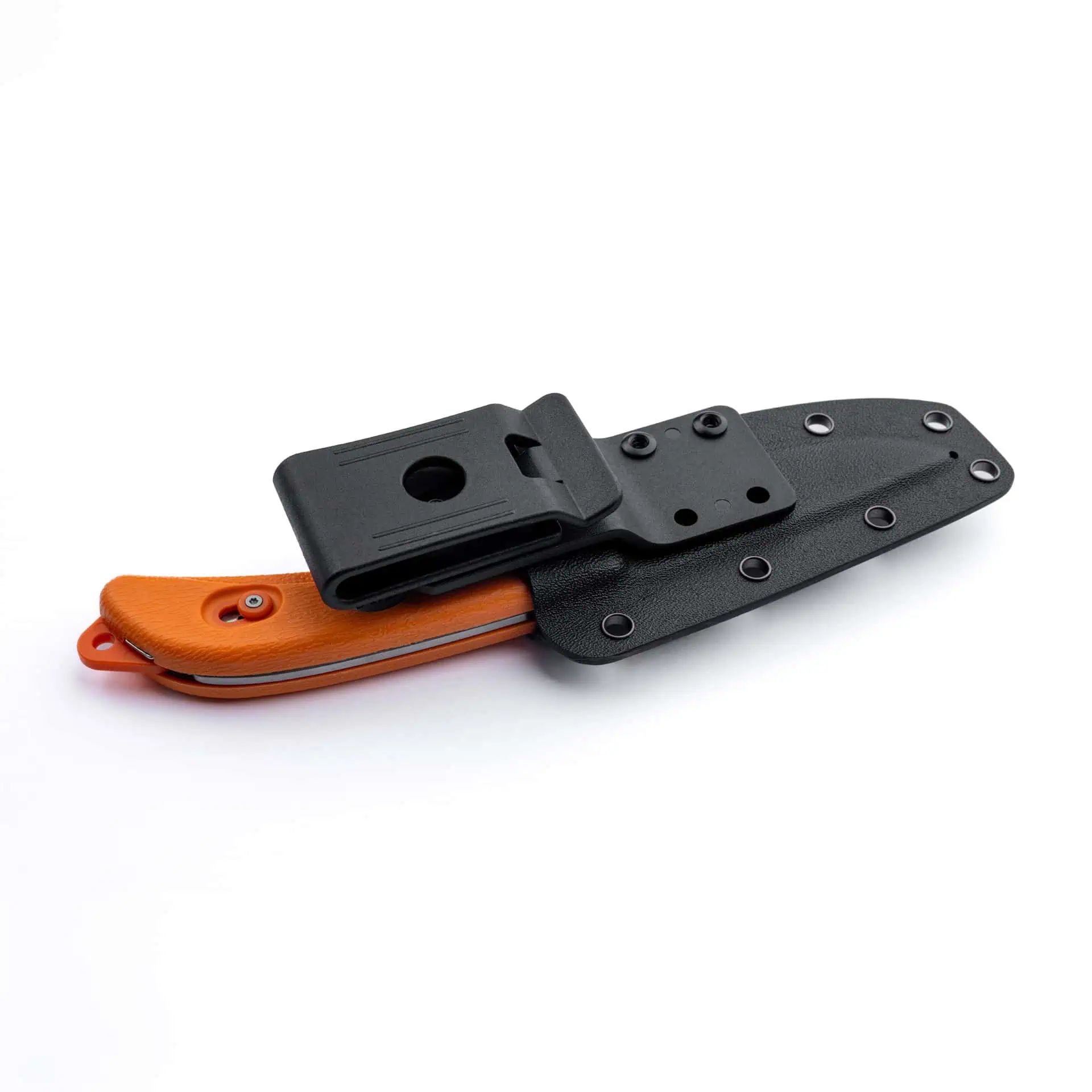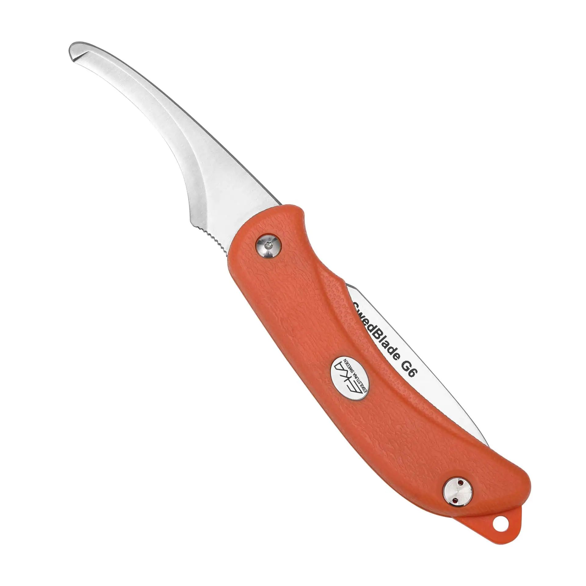 The G6 features a unique, pivoting blade design that allows for a seamless transition between skinning and gutting blades. A simple press of the locking button activates the desired function. Thanks to its intelligent construction, the knife can be disassembled and cleaned without tools — ideal for hygienic use. To extend its lifespan, clean the blade with dish soap after each use, dry it thoroughly, and sharpen it regularly. The blades are made from high-quality Swedish Alleima 12C27 stainless steel (HRC 57–59), and the ergonomic Proflex™ grip ensures a secure hold, while the Kydex sheath protects the knife when not in use.