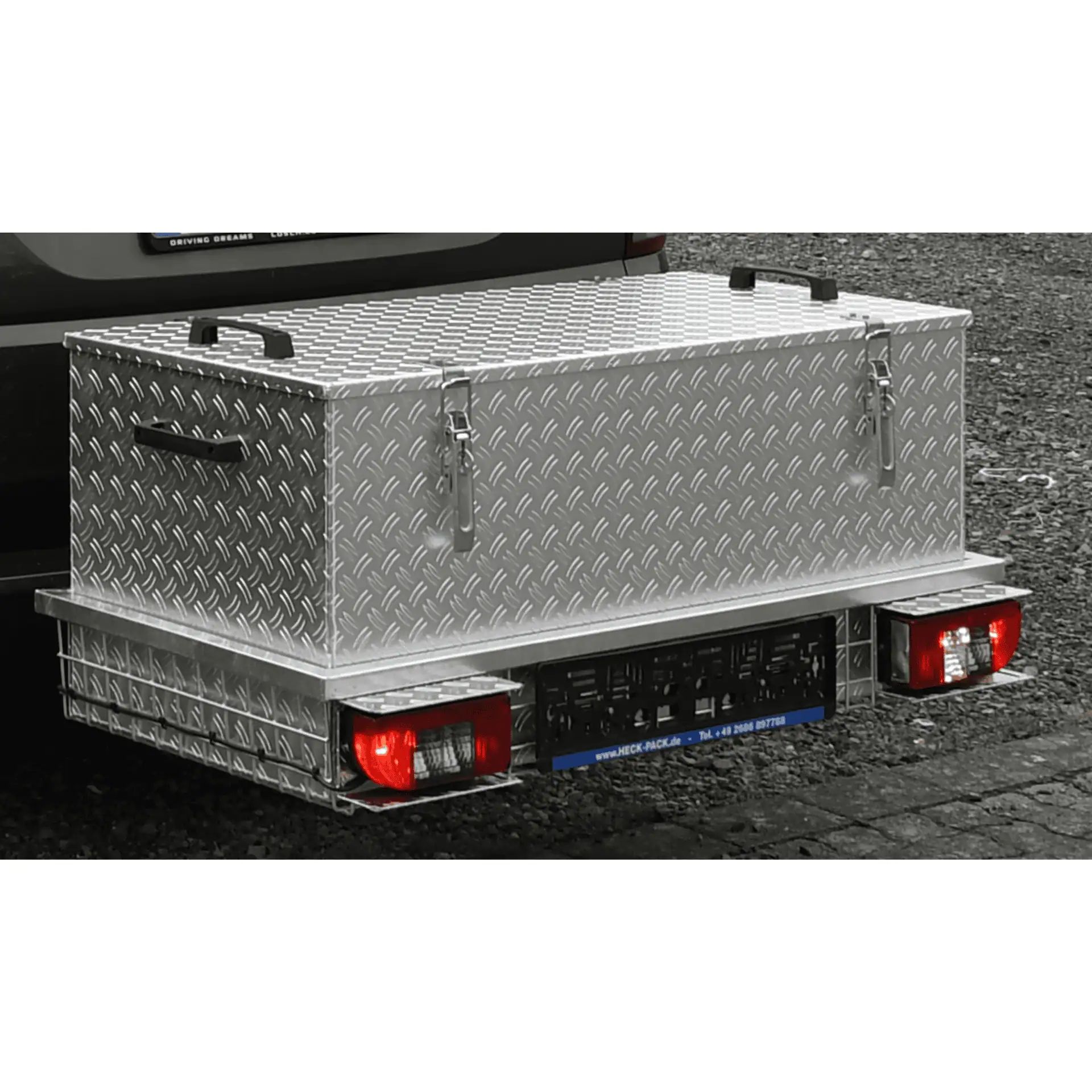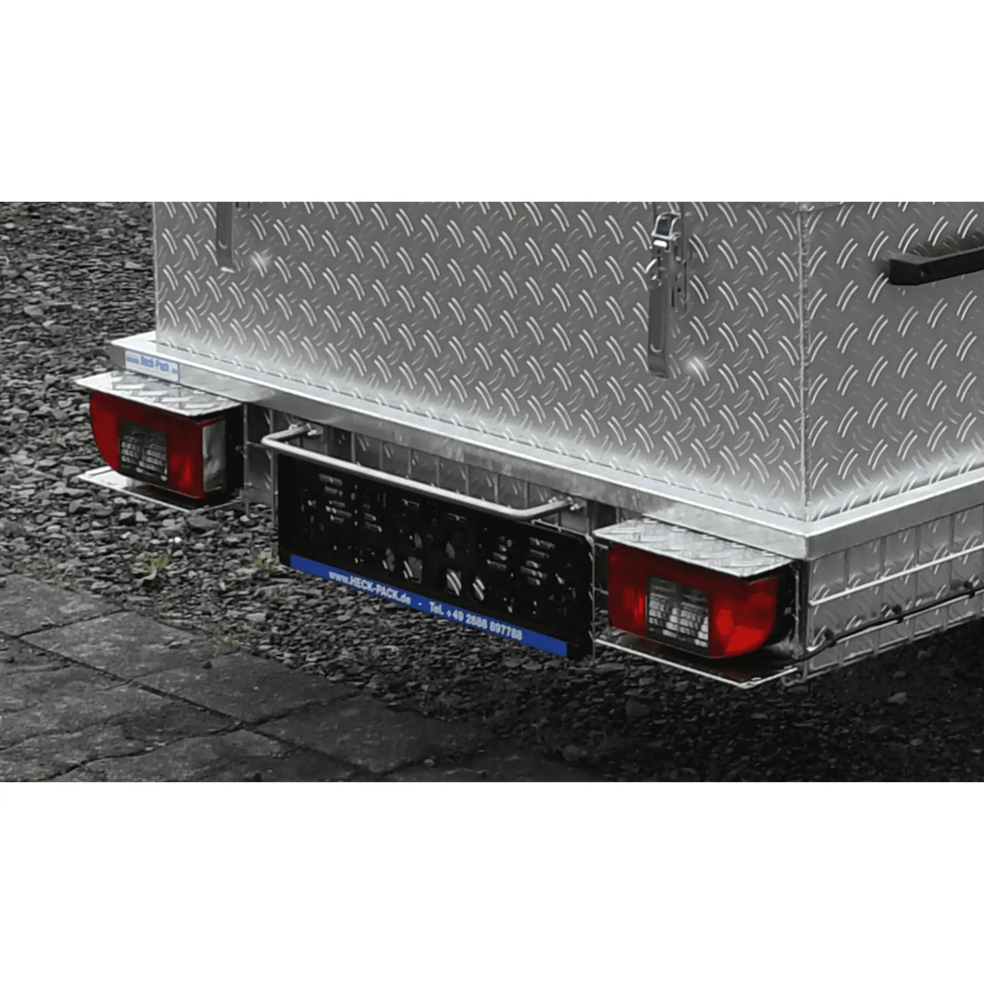 Get the perfect lighting for your rear carrier with the Heck-Pack Lighting Unit. Equipped with a 7-pin connector, this unit offers everything you need: turn signal, brake, tail, fog, and license plate lights. Completely pre-wired and including mounting materials as well as light bulbs, it is the ideal solution when the lights are obscured on the vehicle. The robust protection unit made from durable, thick-walled aluminum checker plate ensures everything stays safe and stable. The bent aluminum sheets with finely laser-cut cutouts are carefully drilled to make installation as easy as possible. Additionally, the edge protection made from high-quality edge banding provides extra protection.