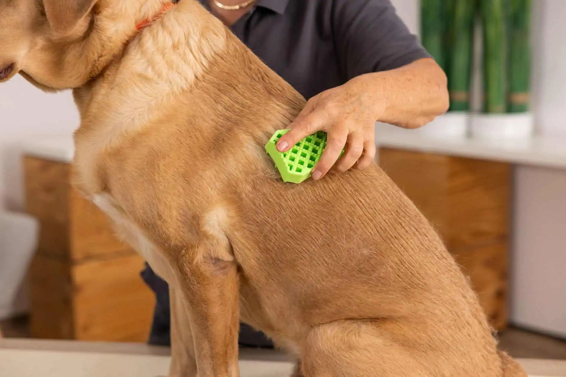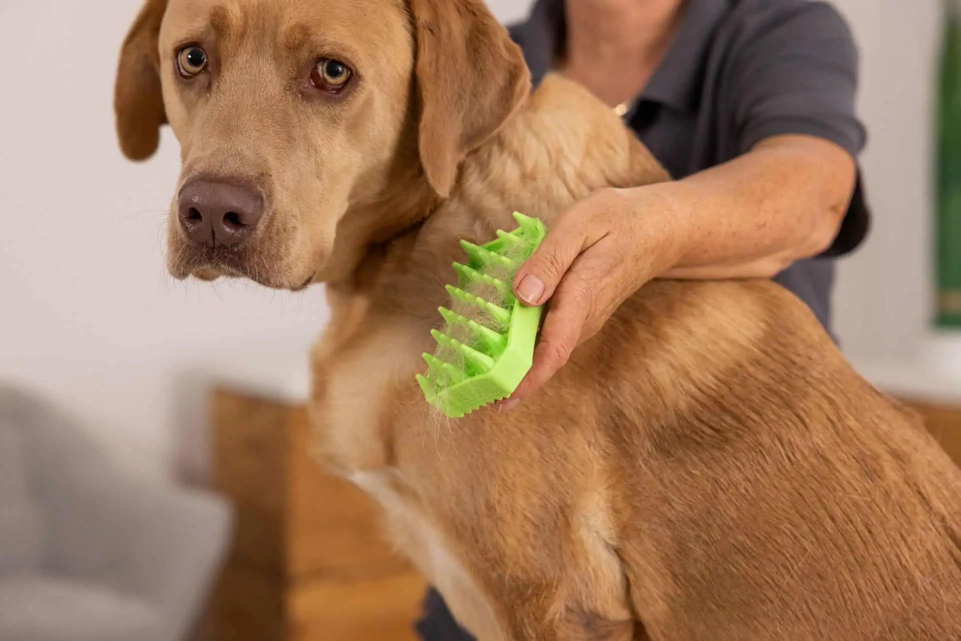 The Sheddy rubber brush can be used during each grooming session to remove loose hair and undercoat.