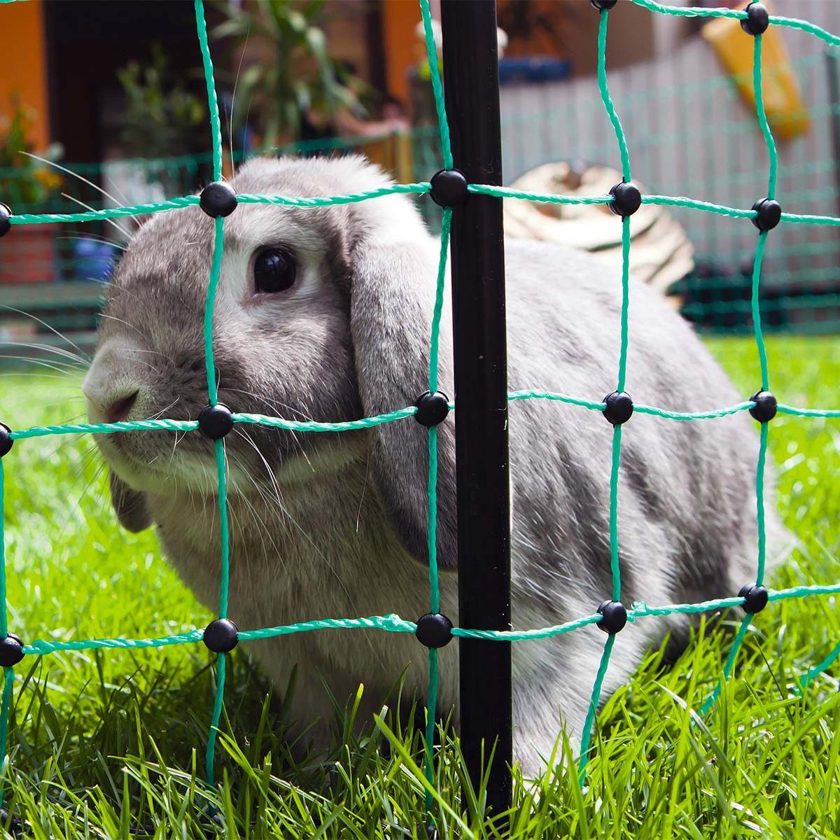 Med kaninnätet håller du dina gnagare säkra utomhus. Den särskilt små maskstorleken på 5,9 cm garanterar maximal säkerhet för boskapsskötseln. För att förhindra att nätet naggas sönder eller för att ytterligare skydda kaniner och harar från inkräktare kan nätet eventuellt drivas med elektricitet.