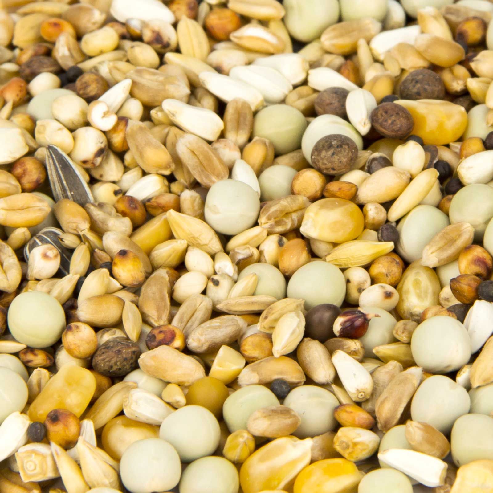 23 % små ärtor, 19 % vete, 9 % hjärtfrö, 9 % milofrö, 8 % pärlmajs, 6 % dari, 5 % vicker, 4 % paddyris, 2 % sojabönor, 7 % havregryn, 2 % solrosfrö, 2 % glansfrö, 2 % svart rova, 2 % maltkorn.