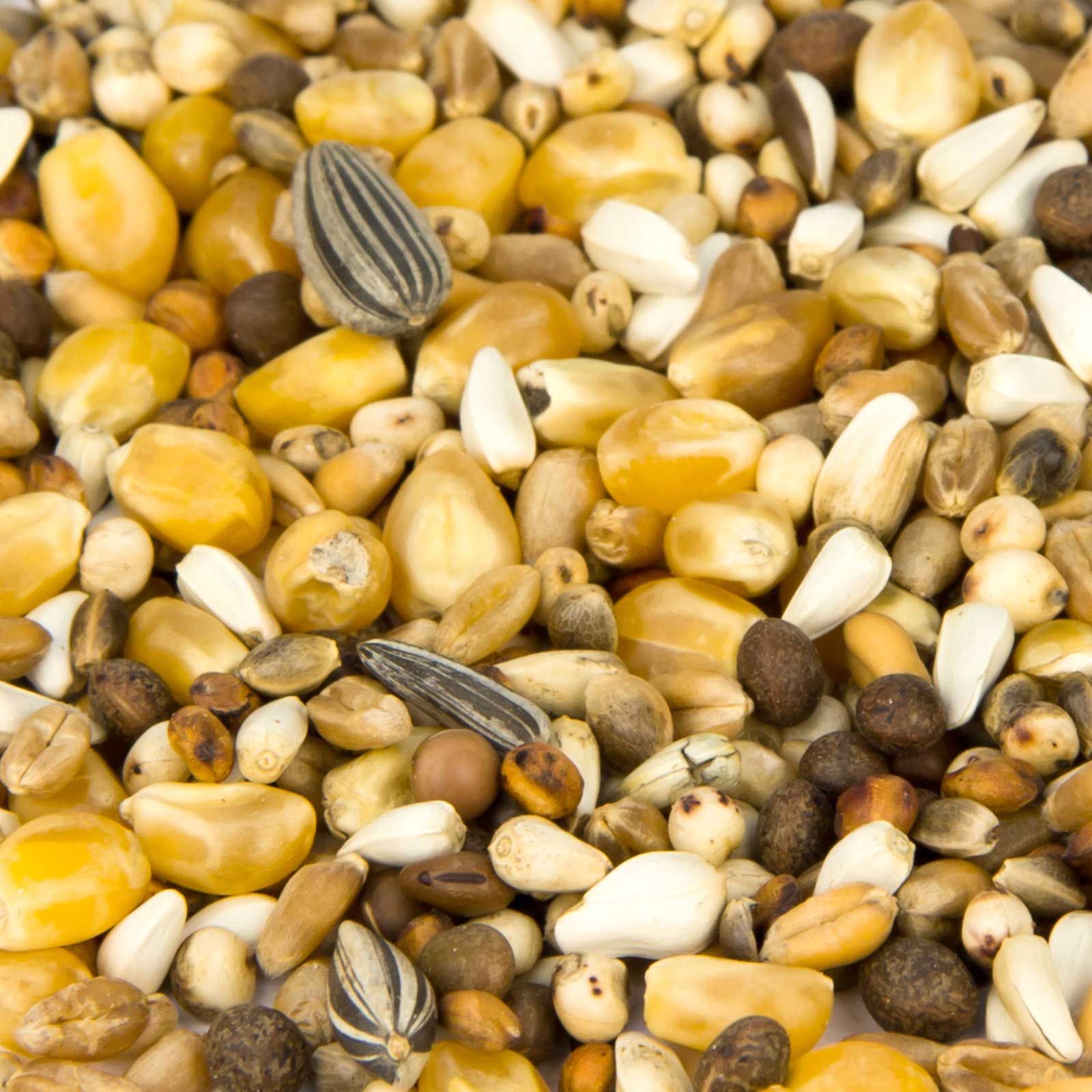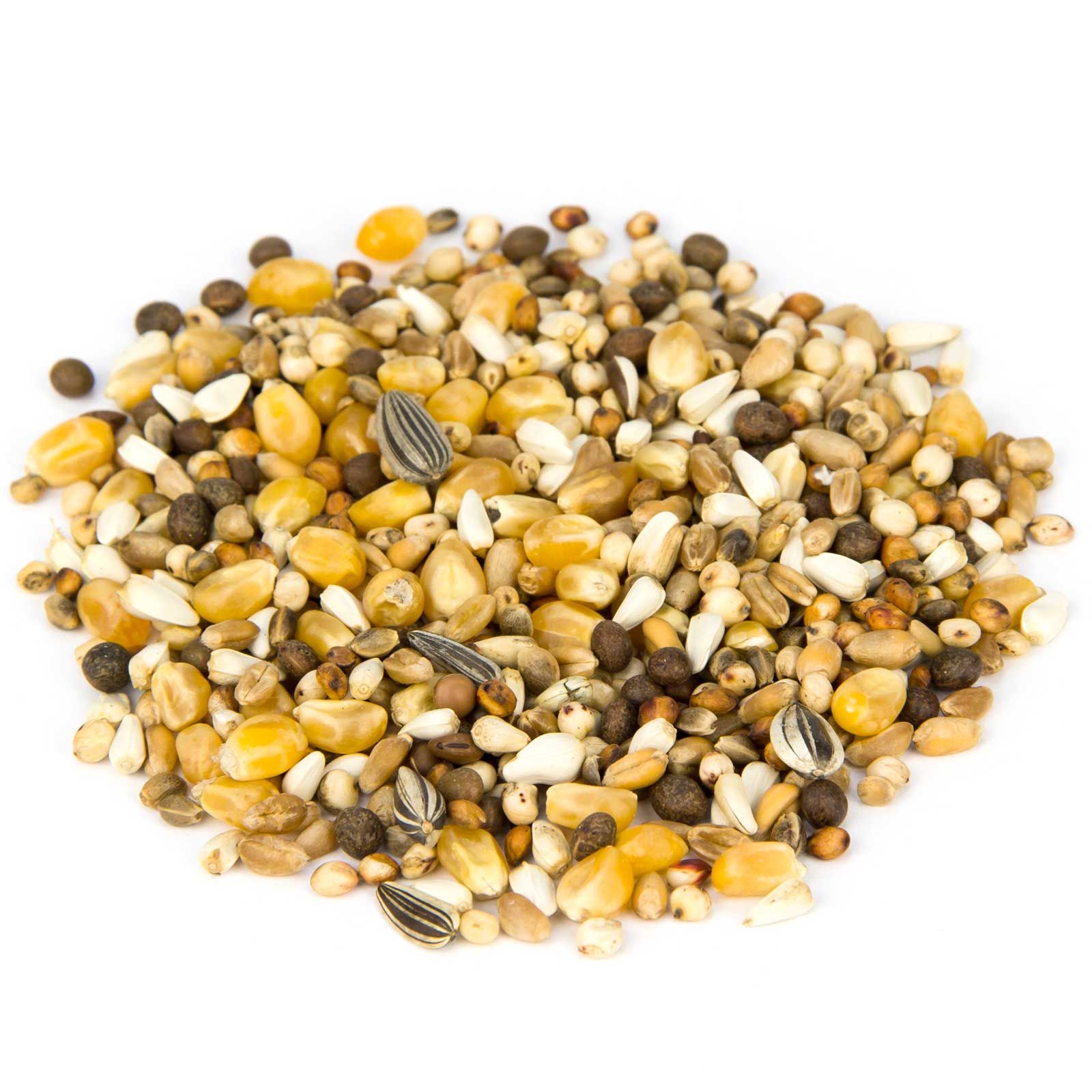 20 % pärlmajs, 18 % vete, 16 % dari, 12 % milokorn, 10 % vicker, 10 % hjärtfrö, 4 % hampa, 4 % havregryn, 3 % solros, 3 % raps.