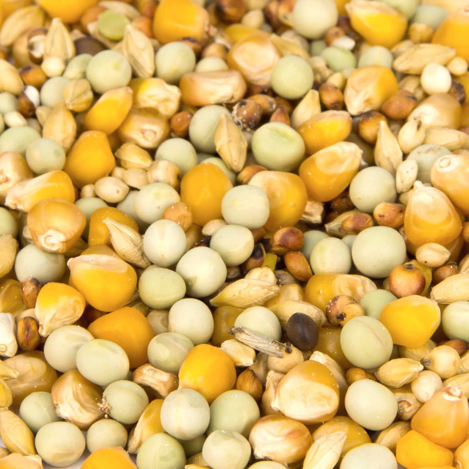 42,0 % liten majs, 20,0 % gröna små ärtor, 17,0 % maltkorn, 14,0 % milokorn, 4,0 % dari, 1,0 % hjärtfrö, 1,0 % gul hirs, 1,0 % vicker