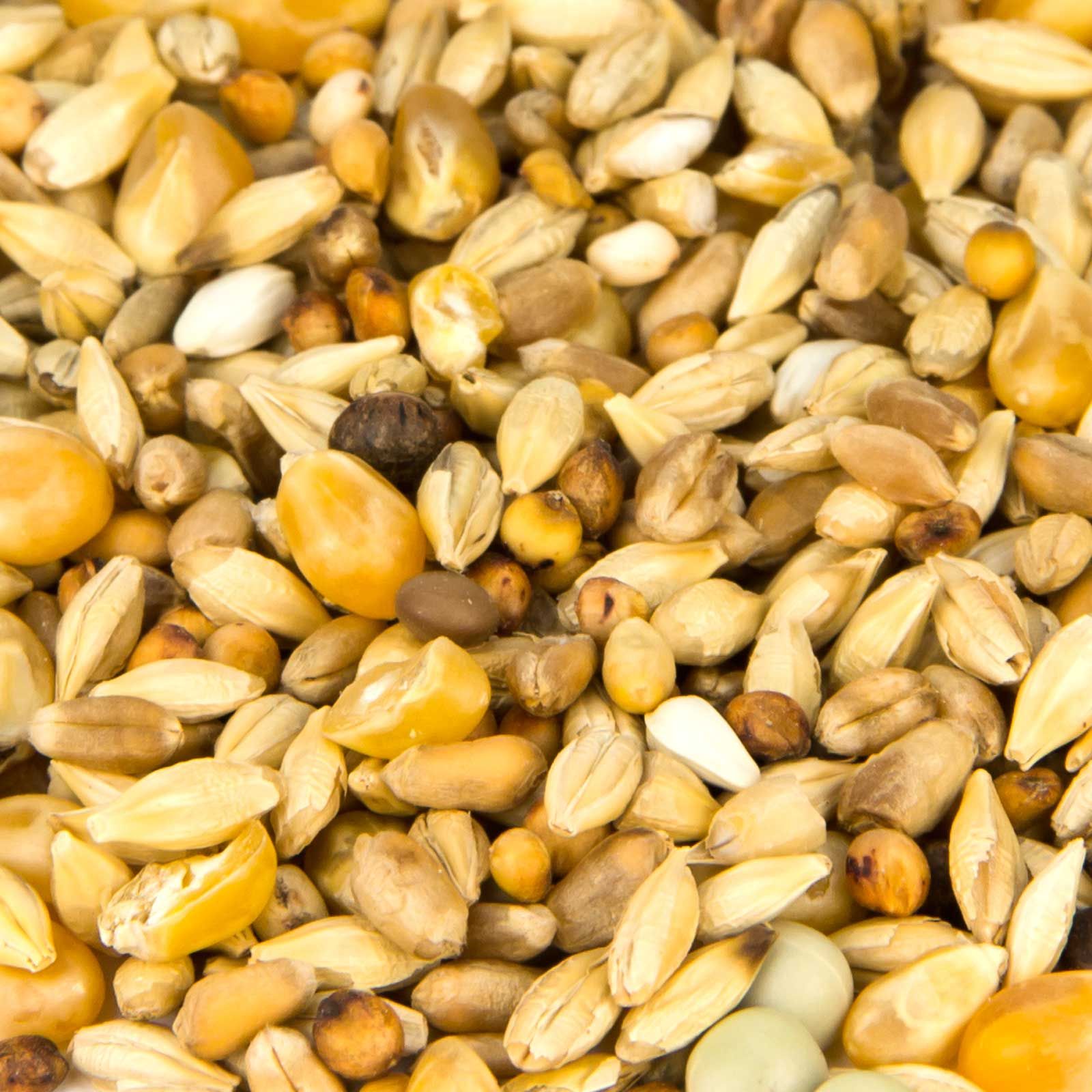 40,0 % maltkorn, 20,0 % liten majs, 20,0 % vete, 10,0 % milokorn, 4,0 % dari, 3,0 % gröna små ärtor, 1,0 % gul hirs, 1,0 % vicker, 1,0 % kardifrön