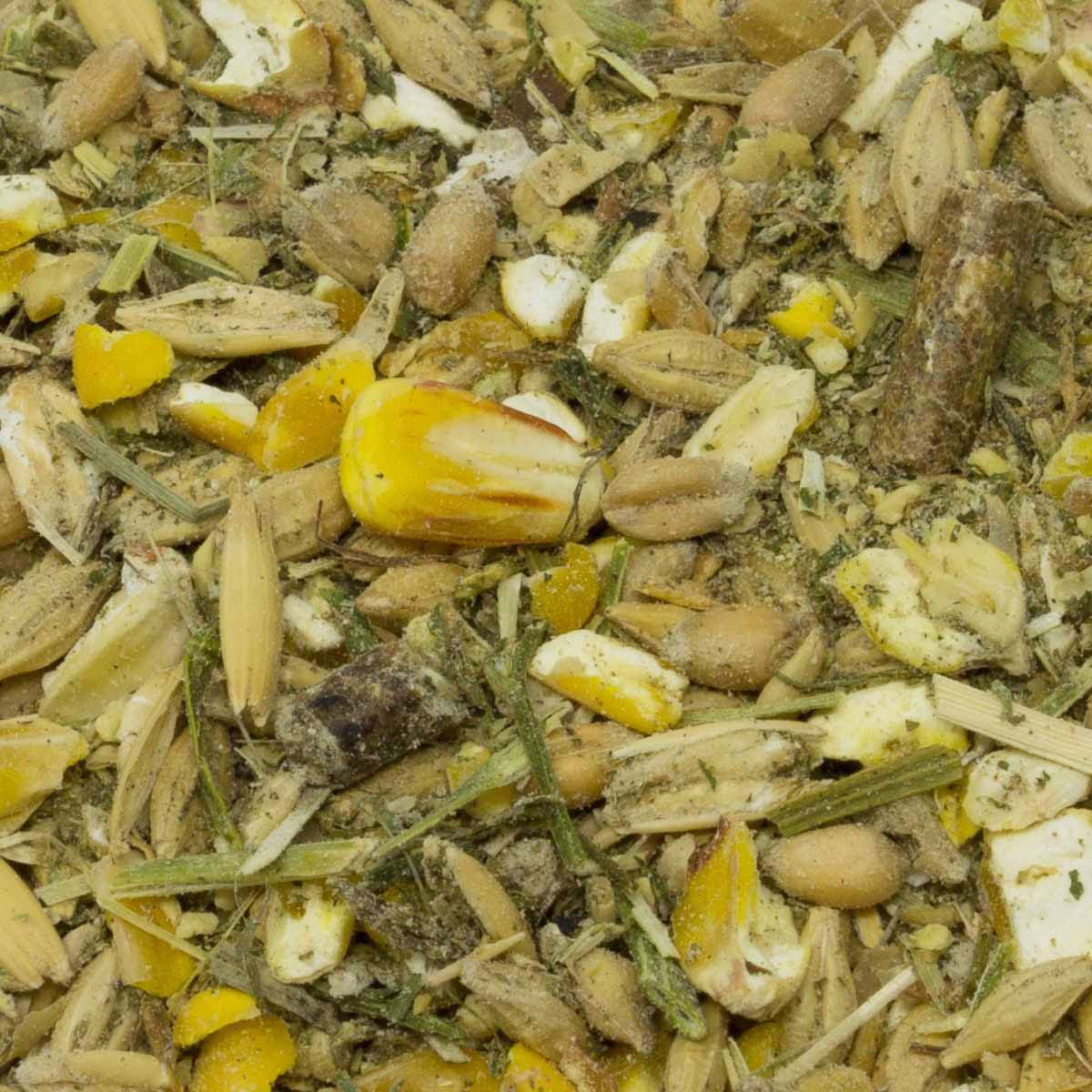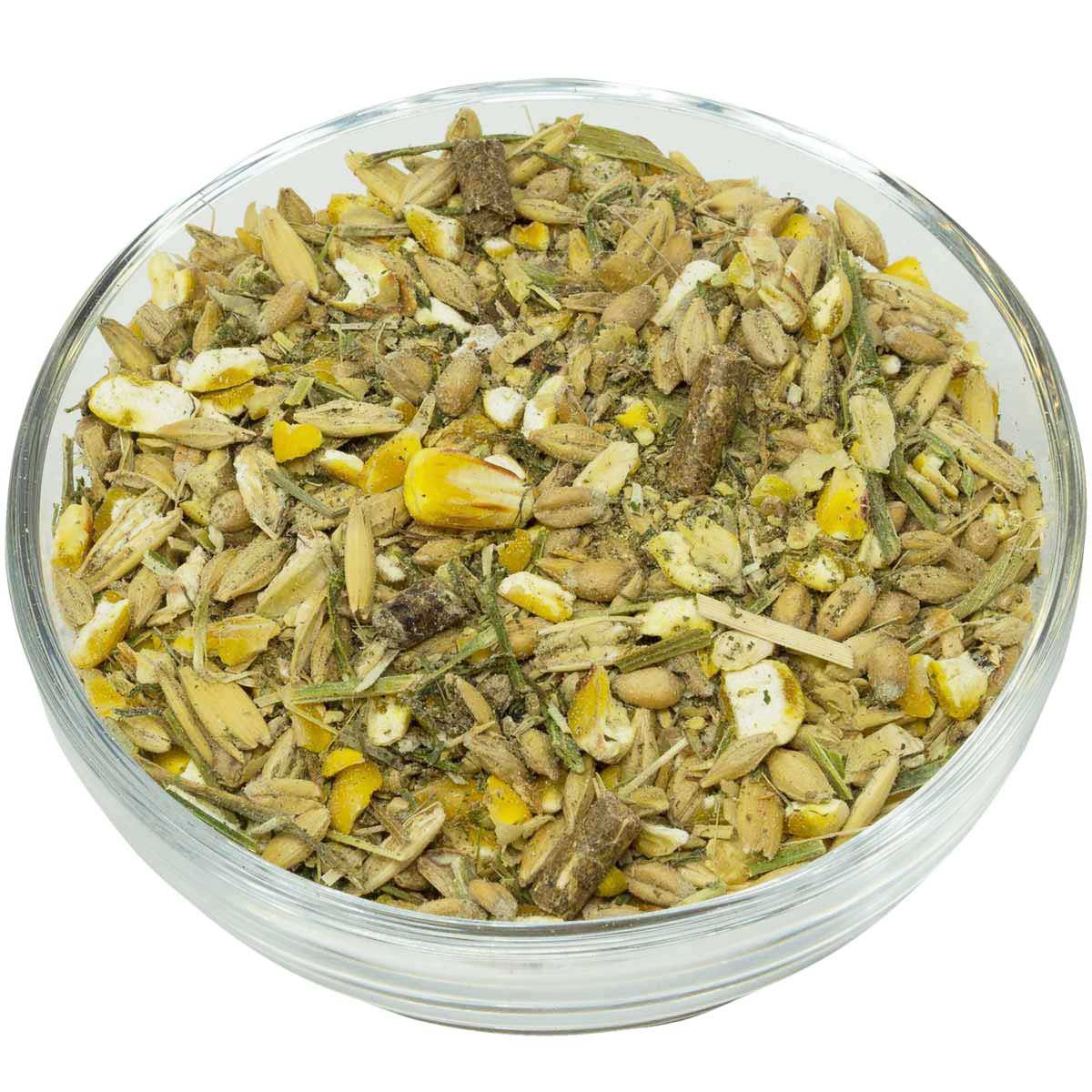 Grovmald majs, korn, vete, krossad havre, extraktionsmjöl av soja (bönor) med såpstock (ånguppvärmda), lucernhår, pellets av grönt lusernmjöl, finkornigt vetekli, betmassa, extraktionsmjöl av linfrö, grässtrån som torkats med hjälp av varm luft, solrosolja, lignocellulosa, kalciumkarbonat, majsgroddar